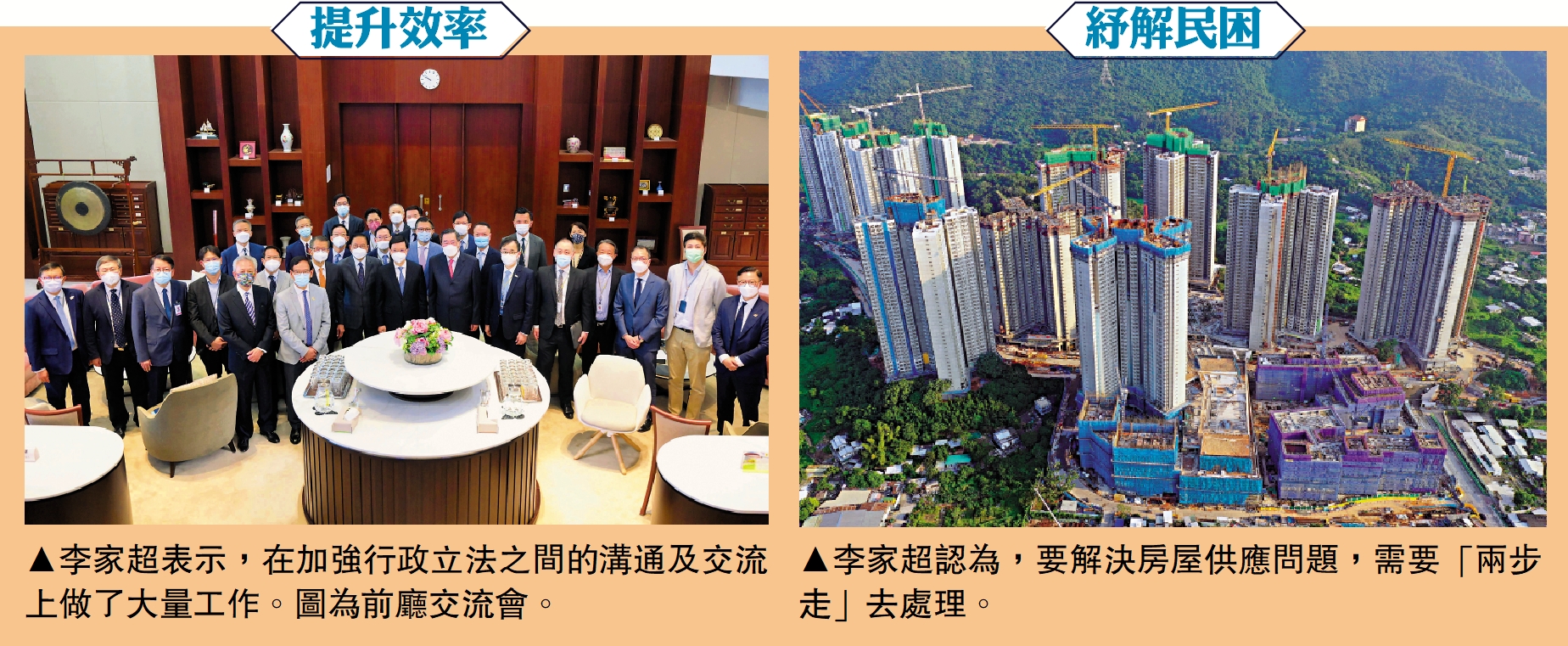 李家超認為,解決房屋供應需「兩步走」,政府興建大量公營房屋,讓輪候公屋的市民符合有關申請條件便可入住,「希望市民盡快入住公屋,我上任時輪候時間是6.1年,我制定了政策要『封頂』不准再多,目標是4.5年,這是第一步。」但更重要是在這個過程中亦要取締不適切居所,讓其住戶逐步搬遷至適切的居所,「譬如現有的過渡性房屋、簡約公屋,希望在(公屋)供應不足夠的層面去填補,讓他們看到希望。」