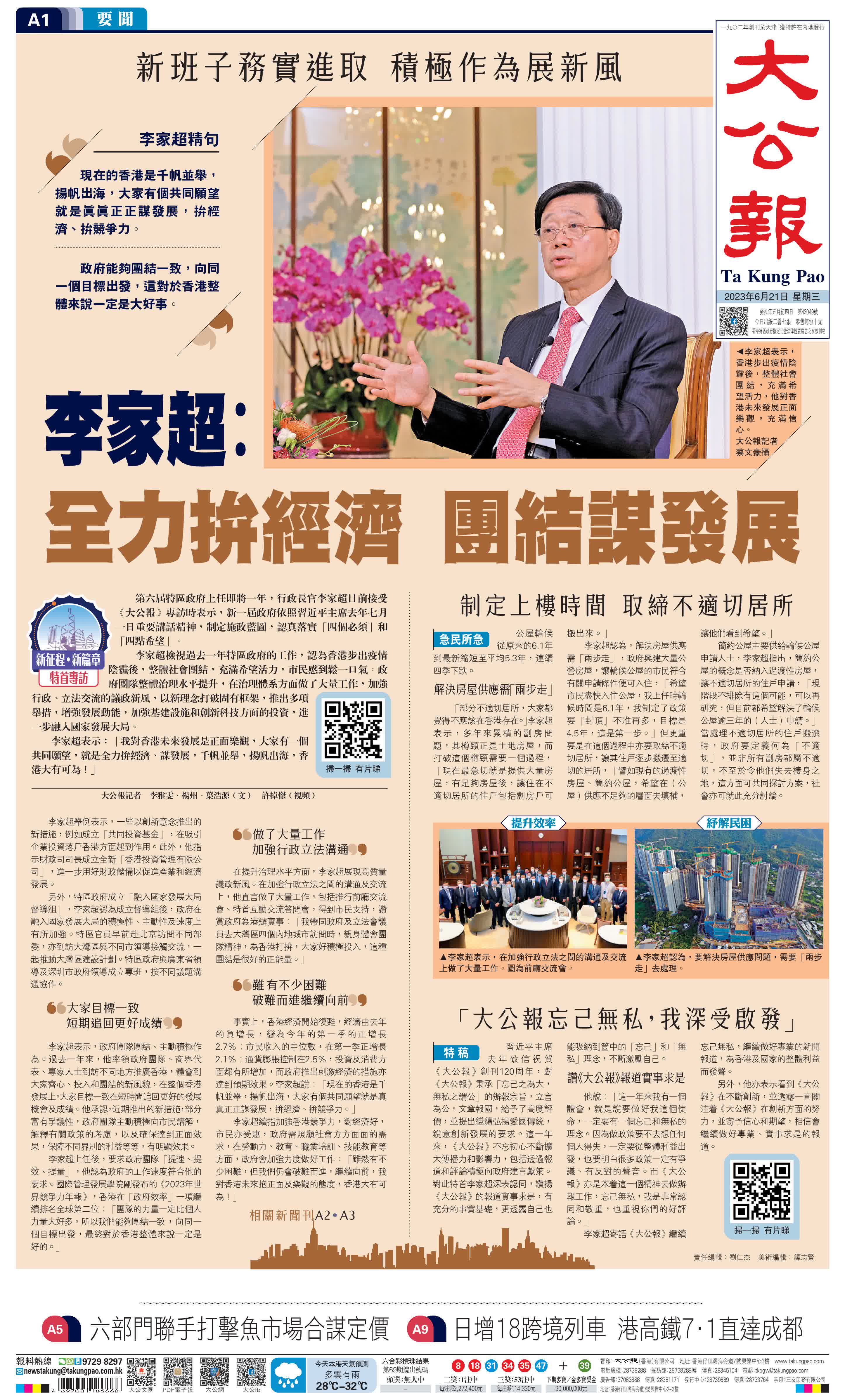 習近平主席去年致信祝賀《大公報》創刊120周年,對《大公報》秉承「忘己之為大,無私之謂公」的辦報宗旨,立言為公,文章報國,給予了高度評價,並提出繼續弘揚愛國傳統,銳意創新發展的要求。這一年來,《大公報》不忘初心不斷擴大傳播力和影響力,包括透過報道和評論積極向政府建言獻策。對此特首李家超深表認同,讚揚《大公報》的報道實事求是,有充分的事實基礎,更透露自己也能吸納到箇中的「忘己」和「無私」理念,不斷激勵自己。