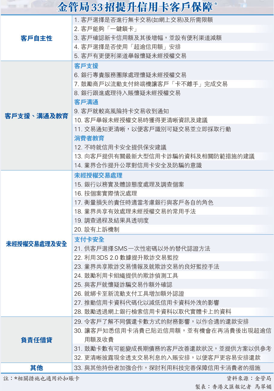 金管局副總裁阮國恒昨向銀行發出通函,主要講述「支付卡客戶保障的主要優化措施」,內文提到金管局自去年起諮詢銀行業界,並透過今年初銀行公會成立的專責小組,認為銀行應在上述四大範疇進一步加強對支付卡客戶的保障,因此詳列33招優化措施,冀銀行盡快採取措施以遵守這些要求,而考慮到準備時間,不涉及系統變更的要求將於本月底生效,對於涉及系統變更的要求,銀行應在6個月內、即今年底前符合要求。