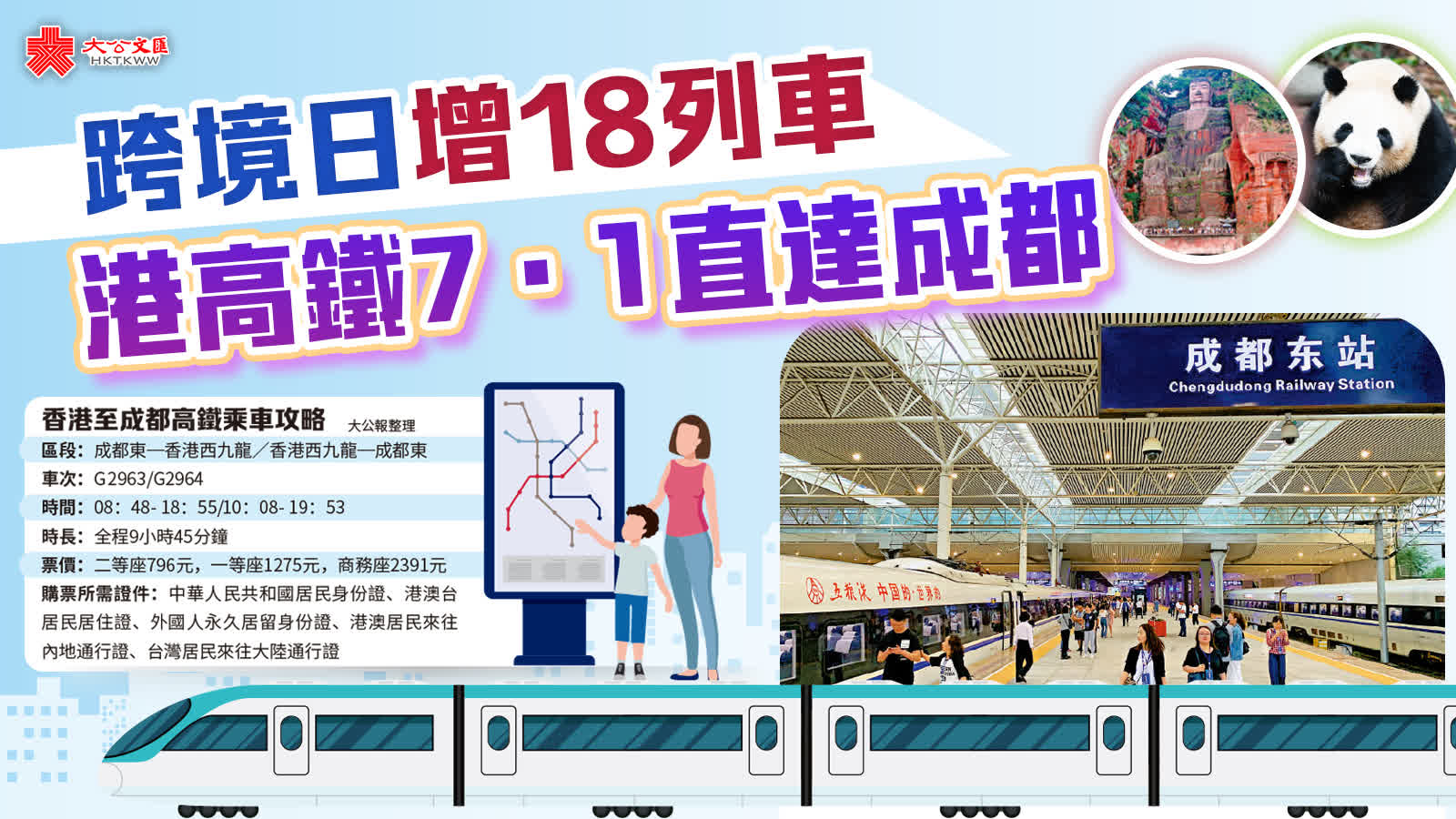 該車次經成貴高鐵、貴廣高鐵至香港,將進一步便利川港兩地及沿線民眾往來。據成都局集團公司介紹,成都客運段甄選出70餘名成都東往返香港西九龍線路乘務人員,按照「一長五員」定員搭建10個乘務班組,所有列車員均進行了手語、英語、粵語的專項培訓;同時,以「魅力端莊、秀麗東方」為主題,重新設計了列車員制服,將中國文化、鐵路元素、服務理念進行有機融合,以體現巴蜀特色。