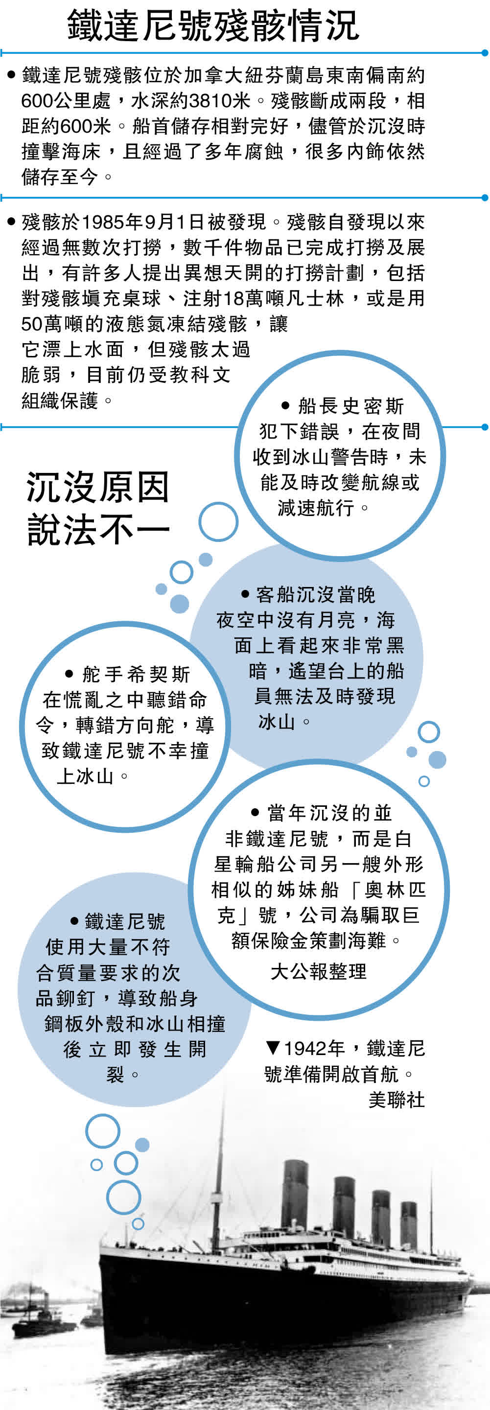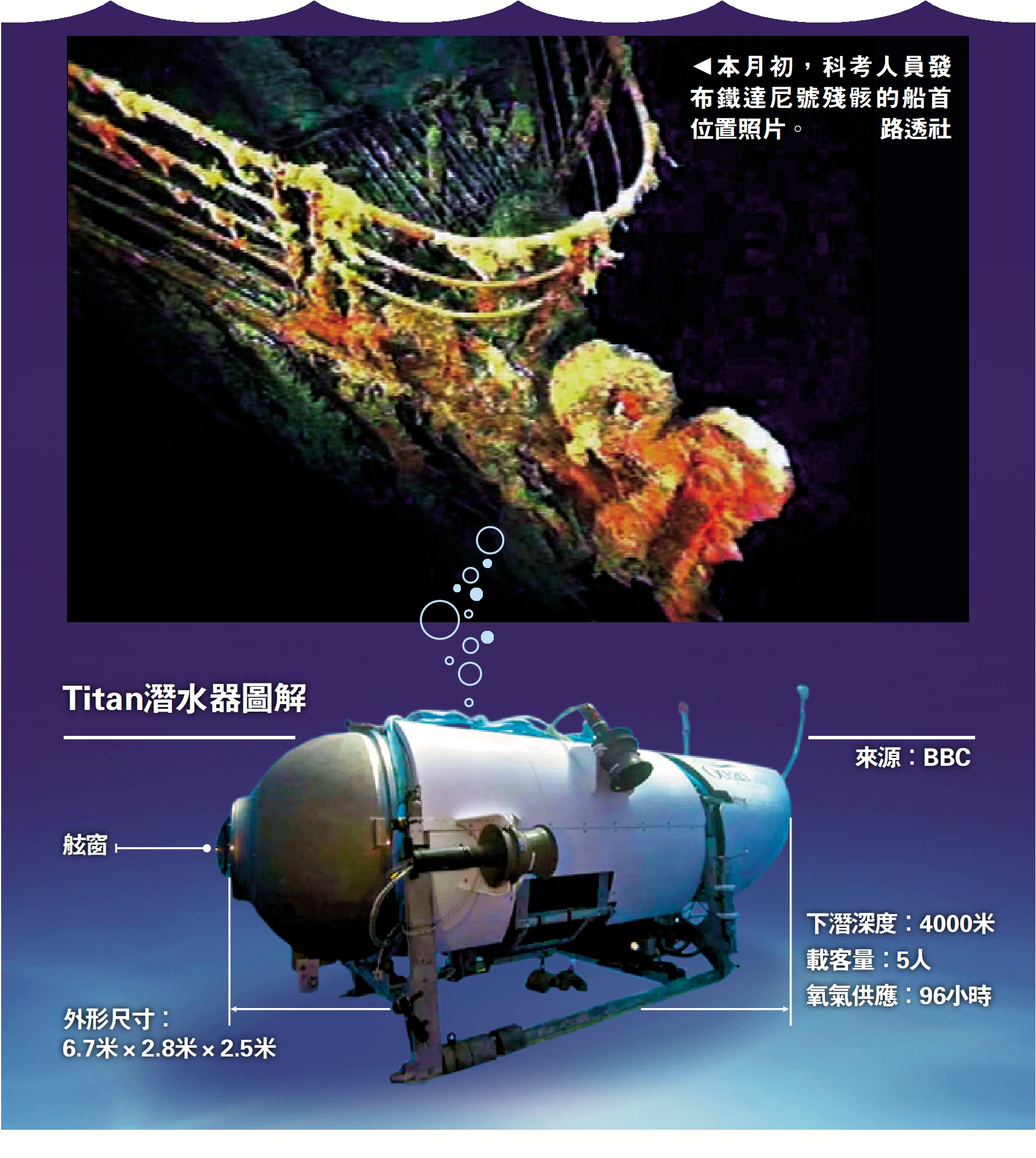 美國私營海底勘探公司「海洋之門探險」是失聯潛水器的運營商,該公司上周公布一段一分鐘視頻,生動展示鐵達尼號殘骸在海底的景象。該視頻凸顯只要夠富有,旅遊景點不僅可延伸到太空,還可潛入深海之中。「海洋之門探險」的鐵達尼號沉船之旅收費高達每人25萬美元,每趟旅程持續約8小時。