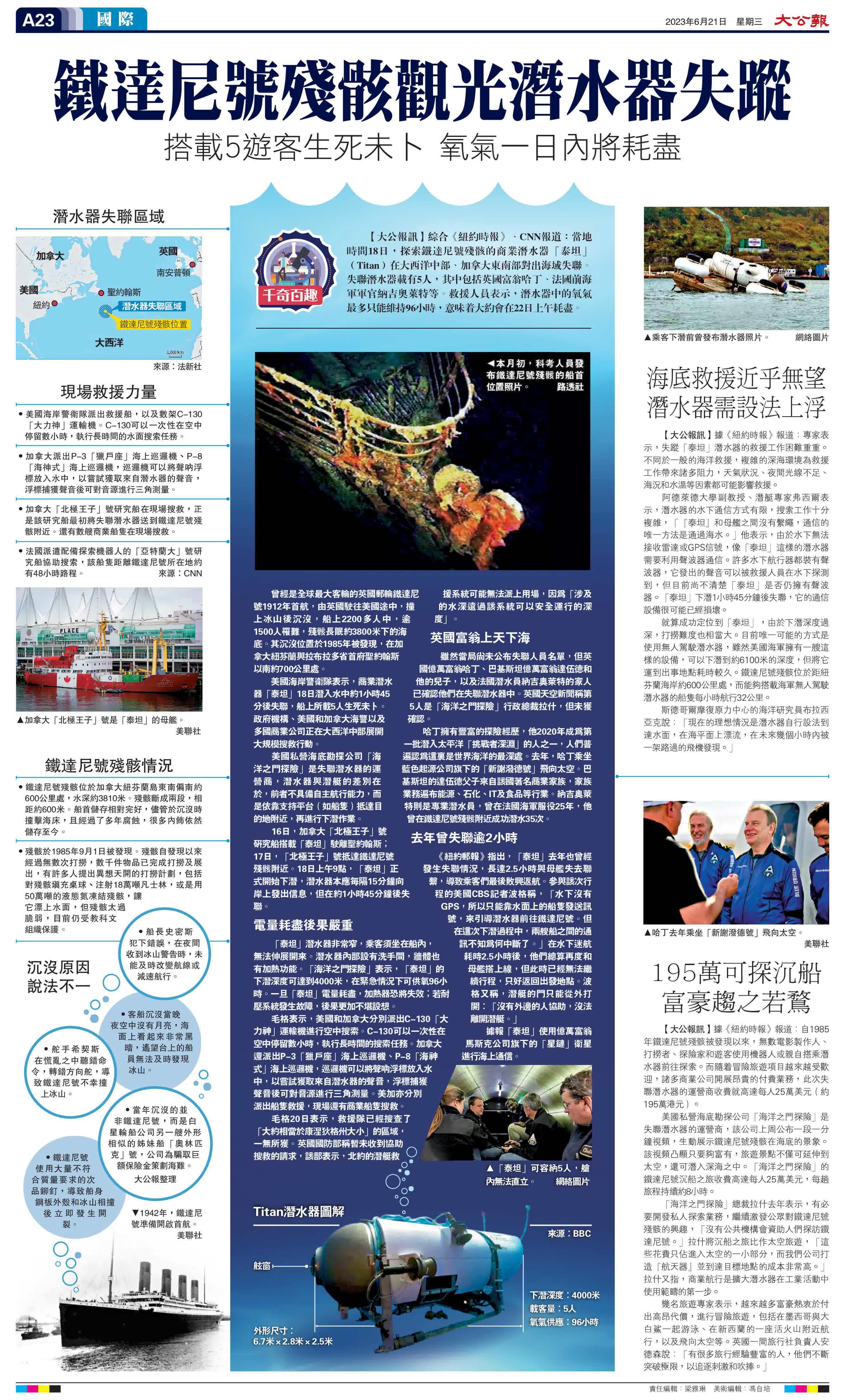 大公報綜合《紐約時報》、CNN報道,當地時間18日,探索鐵達尼號殘骸的商業潛水器「泰坦」(Titan)在大西洋中部、加拿大東南部對出海域失聯。失聯潛水器載有5人,其中包括英國富翁哈丁、法國前海軍軍官納吉奧萊特等。救援人員表示,潛水器中的氧氣最多只能維持96小時,意味着大約會在22日上午耗盡。