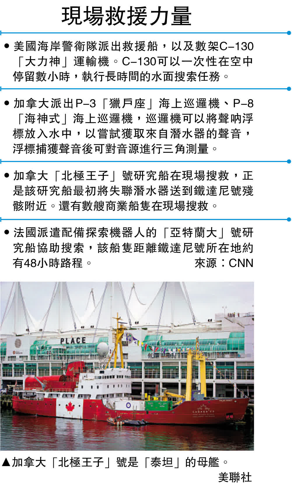 毛格表示,美國和加拿大分別派出C-130「大力神」運輸機進行空中搜索。C-130可以一次性在空中停留數小時,執行長時間的搜索任務。加拿大還派出P-3「獵戶座」海上巡邏機、P-8「海神式」海上巡邏機,巡邏機可以將聲吶浮標放入水中,以嘗試獲取來自潛水器的聲音,浮標捕獲聲音後可對音源進行三角測量。美加亦分別派出船隻救援,現場還有商業船隻搜救。