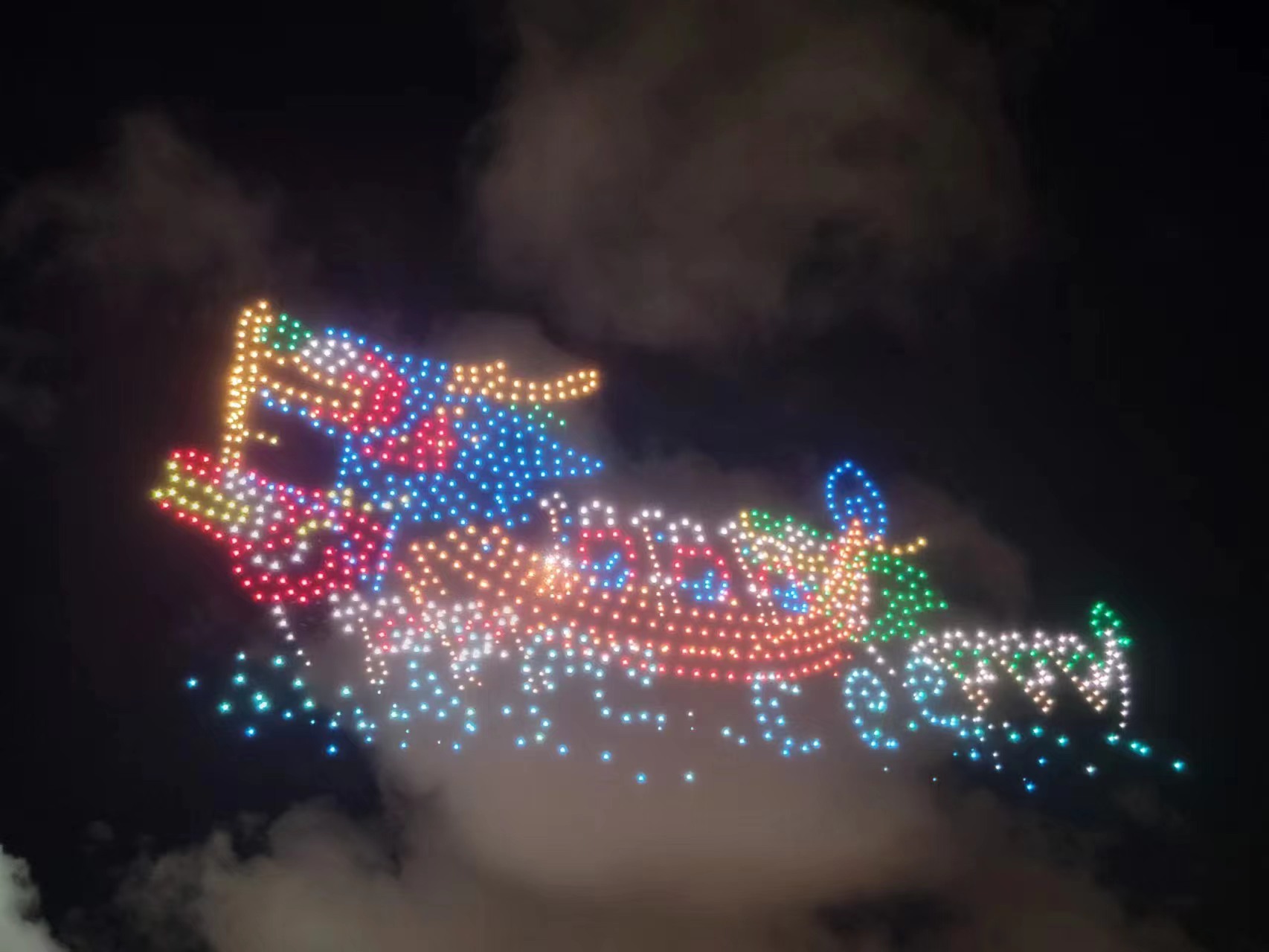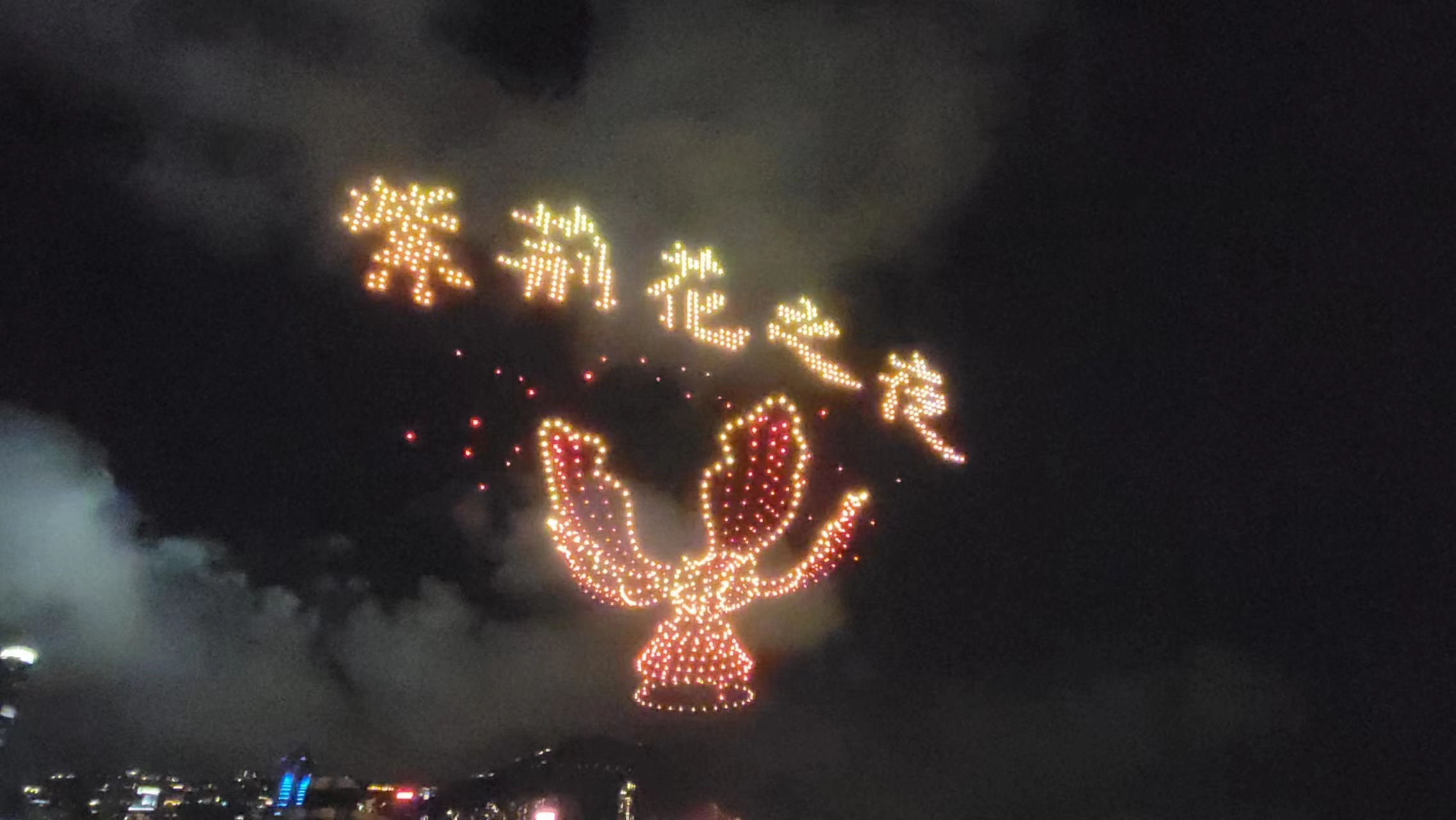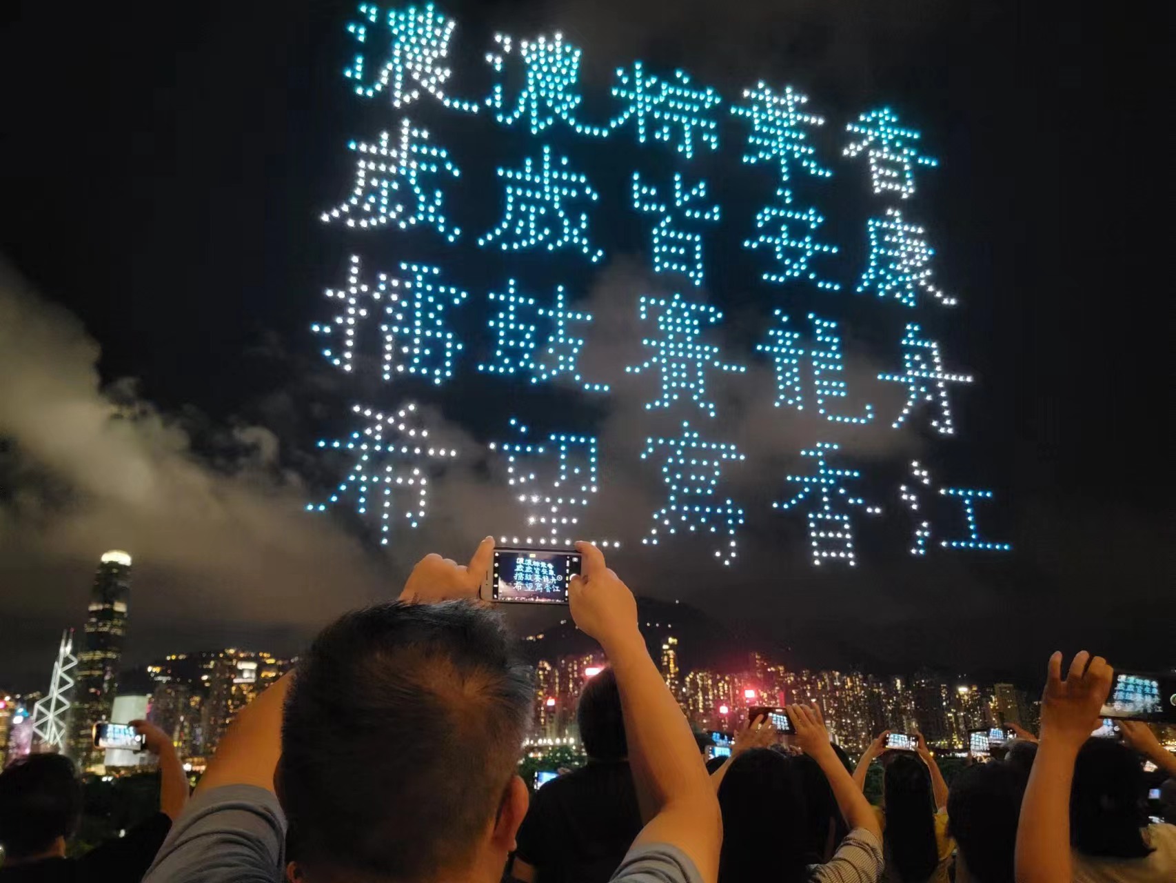 千架無人機配合得宜, 變化出一張又一張美麗的圖案,在場的觀眾都發出讚嘆的聲音。最後三條龍舟又化成巨龍,吐出龍珠又幻成「東方之珠」,最終成為高樓林立的繁華夜景,表達出「明日香港,一齊打拚」之寓意。