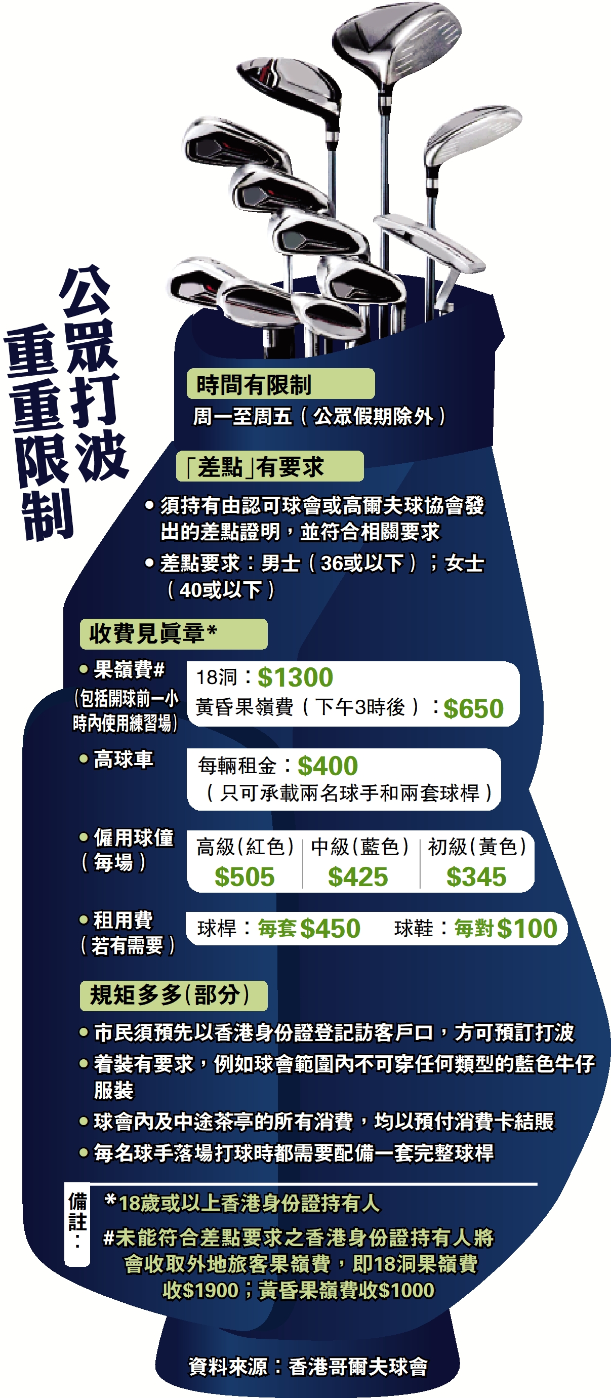 記者深入了解高球場使用規則後更發現,公眾要預約入場打波限制多多,包括只能預約周一至五非公眾假期時段使用,要滿足「差點」(Golf handicap)要求,兩個人打一場高球基本花費料需近4500元,門檻不低。