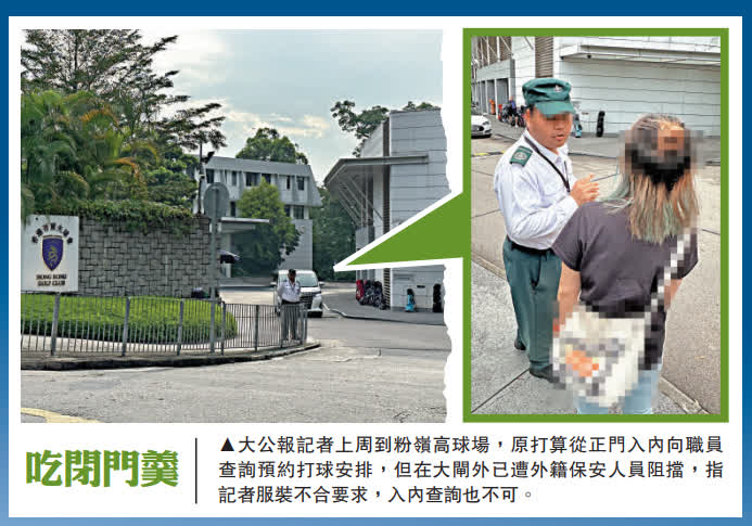 記者上周到粉嶺哥球會查詢預約打球安排,還未入內向職員詢問,已在大閘外遭外籍保安人員阻擋,他提醒記者要穿合適的服裝方可入內,他指記者的T恤沒有衣領、穿工裝褲,即使是入內查詢都不可以,記者只能無奈離開。