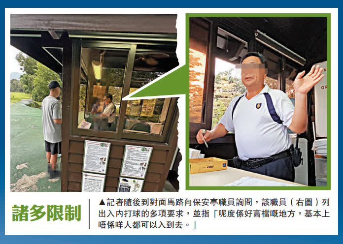 記者隨後到對面馬路,即高球場的公眾停車場旁,向保安亭職員詢問進入高球場夜行徑及預約打球安排。該職員表示,公眾可在傍晚五時至晚上九時使用夜行徑,但須先登記個人資料、進入時間及日期。