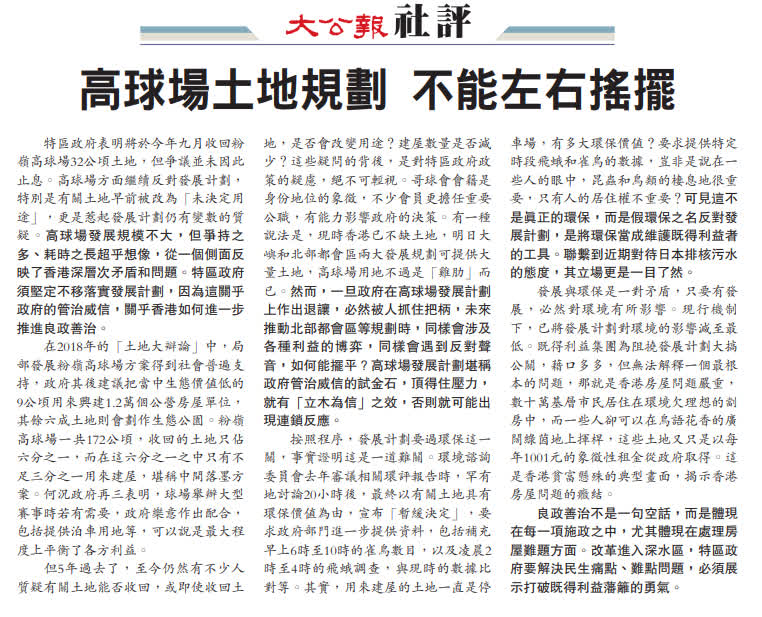 但5年過去了,至今仍然有不少人質疑有關土地能否收回,或即使收回土地,是否會改變用途?建屋數量是否減少?這些疑問的背後,是對特區政府政策的疑慮,絕不可輕視。哥球會會籍是身份地位的象徵,不少會員更擔任重要公職,有能力影響政府的決策。有一種說法是,現時香港已不缺土地,明日大嶼和北部都會區兩大發展規劃可提供大量土地,高球場用地不過是「雞肋」而已。然而,一旦政府在高球場發展計劃上作出退讓,必然被人抓住把柄,未來推動北部都會區等規劃時,同樣會涉及各種利益的博弈,同樣會遇到反對聲音,如何能擺平?高球場發展計劃堪稱政府管治威信的試金石,頂得住壓力,就有「立木為信」之效,否則就可能出現連鎖反應。