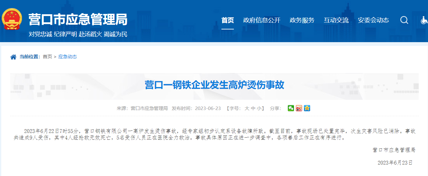 大公文匯全媒體報道,遼寧省營口市應急管理局今日(23日)公布,2023年6月22日7時55分,遼寧省營口市營口鋼鐵有限公司一高爐發生燙傷事故,經專家組初步認定系設備故障所致。截至目前,事故現場已處置完畢,次生災害風險已消除。事故共造成9人受傷,其中4人經搶救無效死亡,5名受傷人員正在醫院全力救治。
