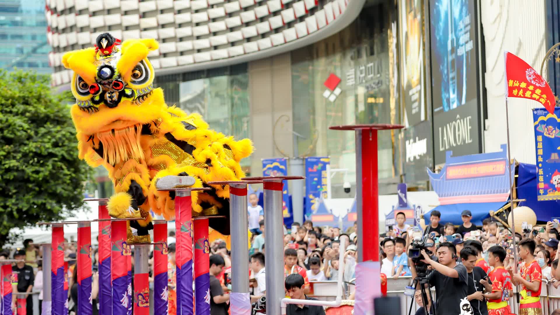 隨着不同分賽點鑼鼓聲響起,參賽獅隊輪番登場,展示「絕活」。一人敲鼓、兩人舞頭尾,招式凌厲、一氣呵成,讓人嘆為觀止。五顏六色的南獅,演繹獅子喜、怒、哀、樂、動、靜、驚、疑等八態,醒獅運動員在高低不等的樁上靈活跑動,時而翹首仰望、時而俯首低顧,將獅子活潑、勇敢、俏皮等形象演繹得惟妙惟肖。在陣陣喝彩中,「獅王」在深圳節日大道榮耀誕生,將現場節日熱浪推向高潮。