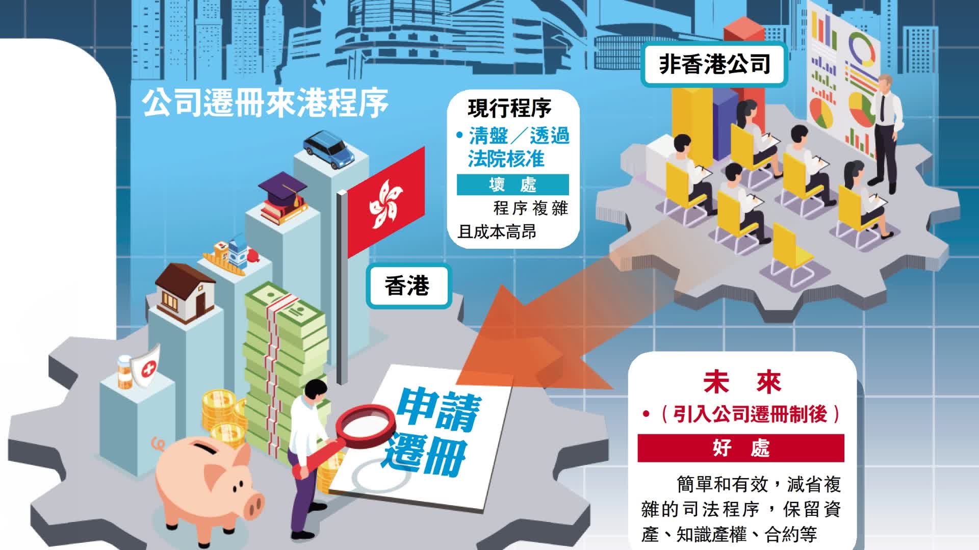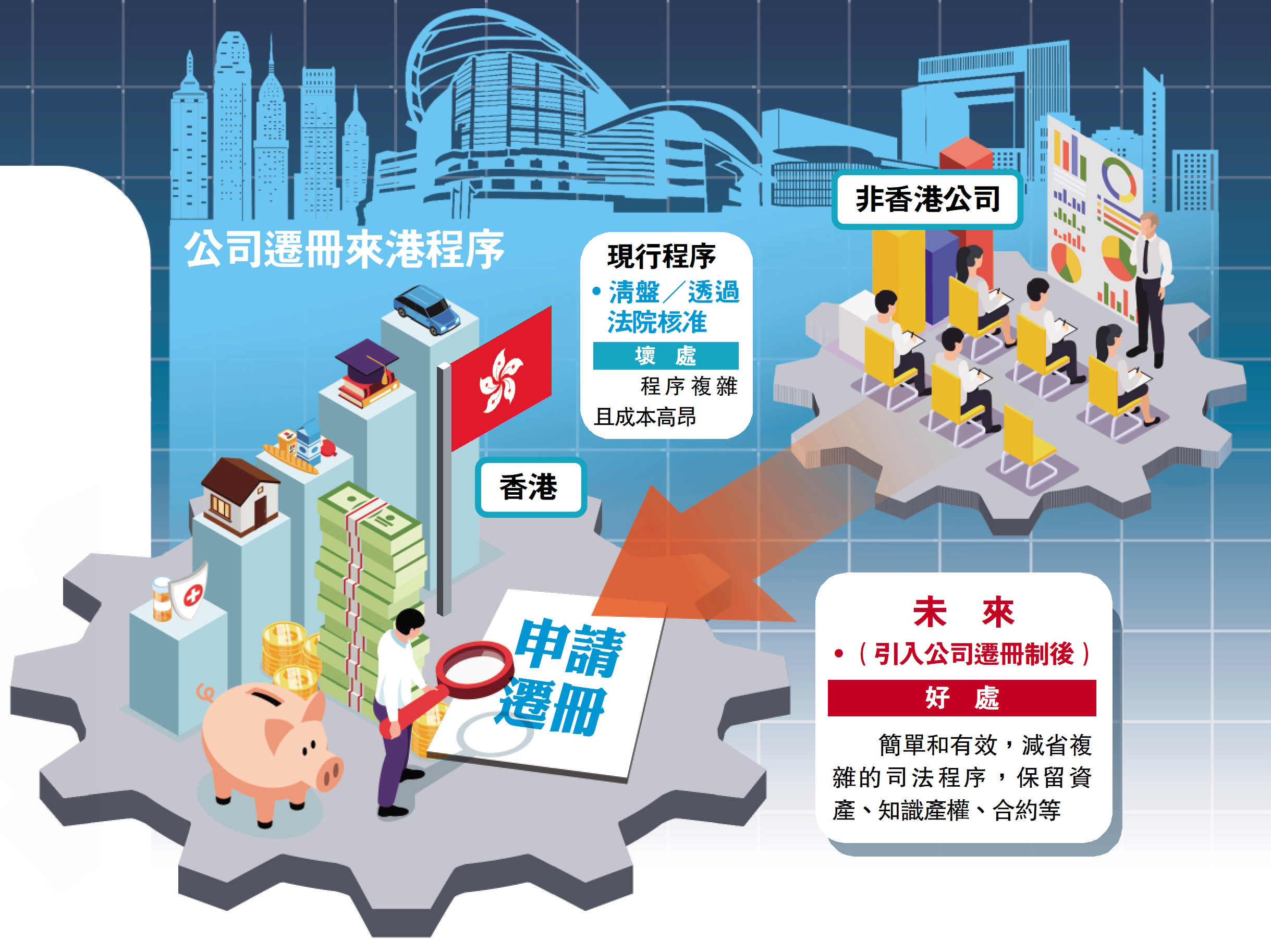 因此,當局在參考基金遷冊機制(2011年11月實施)的正面經驗,以及其他司法管轄區的例子後,認為有條件順應市場需求引入公司遷冊制度。有關公司可透過機制遷冊來港,並保留公司在法律上的法人團體身份,讓公司業務得以持續運作,同時減省複雜的司法程序。
