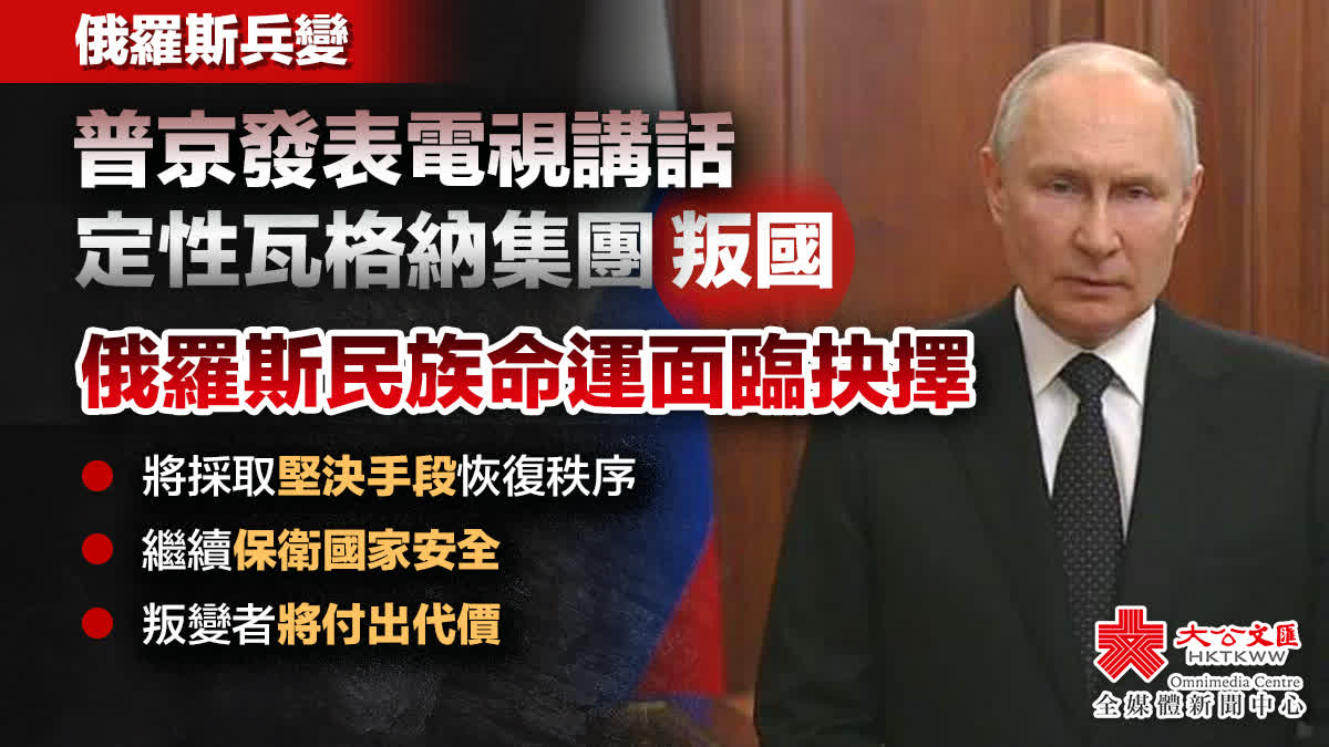 俄羅斯總統普京發表電視講話,定性瓦格納集團叛國,把俄羅斯推向內戰。
