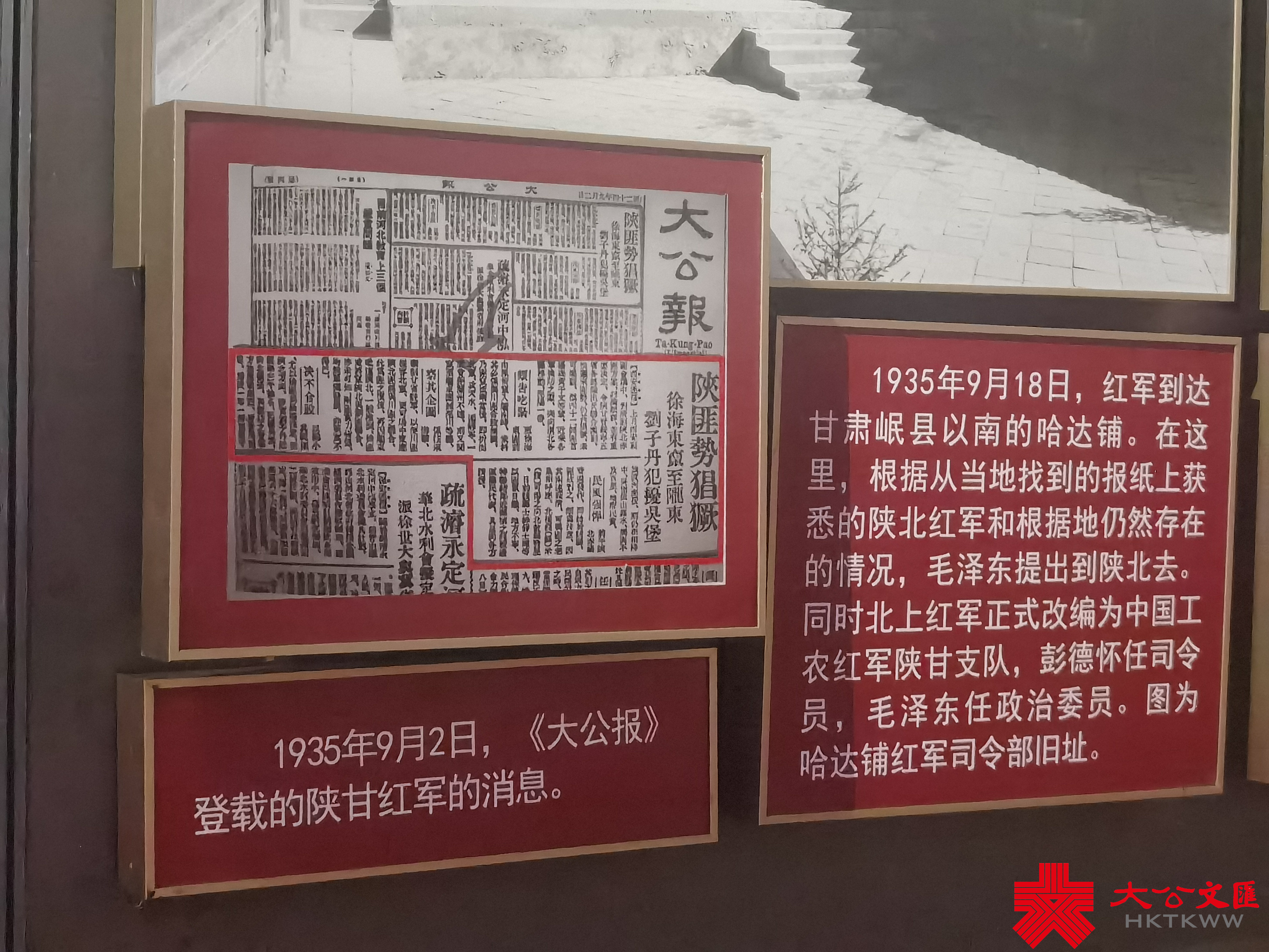 在黨史館第二展廳講述紅軍長征的區域內,陳列着一張1935年9月2日發行的《大公報》版面圖片,報上清晰登載着陝北紅軍劉志丹徐海東部隊和陝北根據地的情況,圖片配文顯示:「1935年9月18日,紅軍到達甘肅岷縣以南的哈達鋪。在這裏,根據從當地找到的報紙上獲悉的陝北紅軍和根據地仍然存在的情況,毛澤東提出到陝北去。同時北上紅軍正式改編為中國工農紅軍陝甘支隊,彭德懷任司令員,毛澤東任政治委員。」 一個月後的10月19日,這支部隊順利抵達陝北吳起鎮,宣告紅一方面軍長征勝利結束。這張珍貴的歷史資料圖,昭示着《大公報》對中國革命航向的關鍵作用,權威引述也佐證了一直以來學術界對於「一張報紙決定紅軍長征方向」的觀點。到陝北去,到陝甘邊區建立革命根據地,這是紅軍長征路上的一次偉大轉折。直到現在,甘肅哈達鋪民間還流傳着「一張報紙定乾坤」的佳話,提醒後人銘記百年報紙《大公報》對中國革命事業無可取代的價值。一位參觀黨史館的遊客秦先生表示,在自己過去的印象裏,民國時代媒體報刊只會存在上海、廣州等大城市。沒想到在天津出版的《大公報》竟然能發行到甘肅山區一個小鎮,完全顛覆了他對近代傳媒傳播力和影響力的認知。