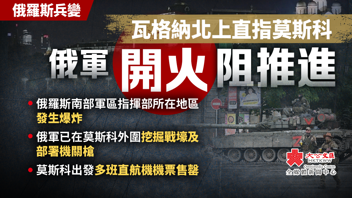 大公文匯全媒體報道,俄羅斯政府的僱傭兵組織瓦格納集團(Wagner Group)今日(24日)發動兵變,正逼近首都莫斯科。香港保安局今晚(24日)表示,當局正密切留意當地情況,如有需要會透過媒體、保安局流動應用程式,以及外遊警示網頁,發布當地最新情況。