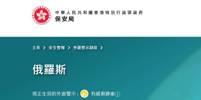 據保安局網頁顯示,當局自2011年起向俄羅斯發出黃色外遊警示,即「有威脅跡象」,呼籲擬前赴當地或已在當地的港人應留意局勢和提高警惕。