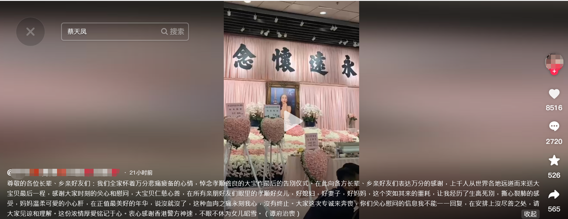 大公文匯全媒體報道,28歲名媛蔡天鳳(Abby Choi)在大埔龍尾村慘被殺害及肢解烹屍。自從女兒遇害後,蔡母「五姐」一度清空社交平台抖音中的日常短片。蔡天鳳家人在上周一(19日)於寶福紀念館為蔡天鳳舉行喪禮,遺體火化後安放在大嶼山寶蓮禪寺內。女兒入土為安後,蔡母昨日(24日)首度在抖音貼上一段長達5分鐘的片段,她撰文感謝各方長輩、鄉親好友們送別女兒,同時還直言女兒離去的血肉之痛永刻在她的心中,沒有終止。