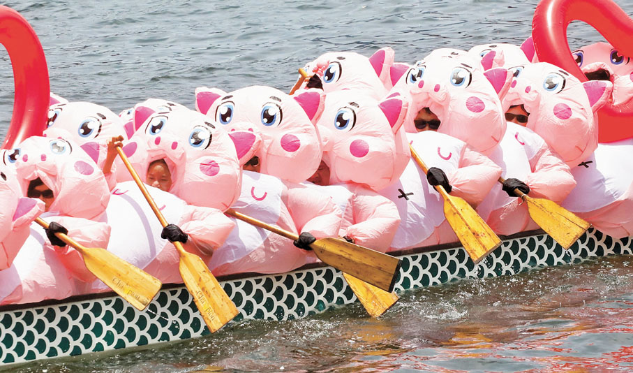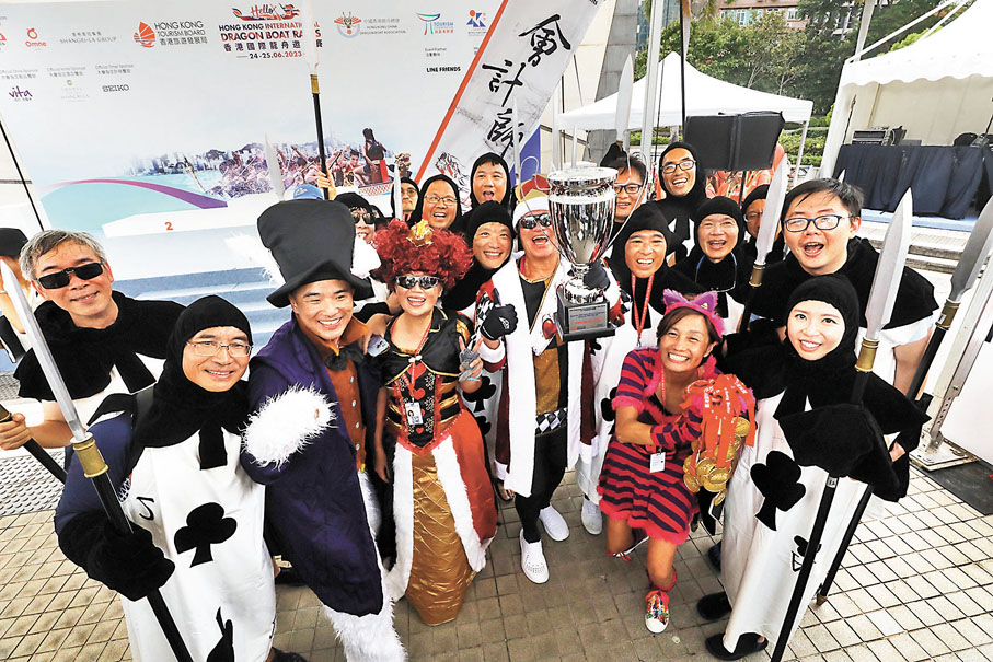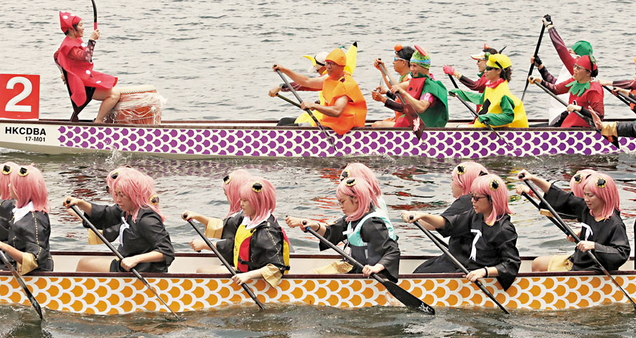 (香港文匯報記者 張弦)香港於疫後邁向全面復常,多項大型國際賽事陸續回歸。闊別4年的「香港國際龍舟邀請賽」一連兩天在維港舉行,超過160支來自10個國家及地區的隊伍參賽,近4,000名龍舟健兒角逐冠軍,於昨日圓滿結束。尖沙咀海濱昨日逼滿了甘受酷熱、觀看賽事的市民及旅客,除了一連串賽事,更有「扮嘢大賽」,多支隊伍穿上奇裝異服「扮鬼扮馬」,有人扮演粉紅充氣豬、扮水果,更有扮成熱門動漫角色,各隊伍所到之處均引起觀眾的關注討論及爭先拍照留念。有年長夫婦忍受酷熱天氣專門到場觀看「扮嘢大賽」各隊伍的服裝,指現場氣氛熱鬧,被大家開心、愉快的心情感染;亦有市民專門帶同5歲兒子觀看賽事,感受傳統文化活動的魅力之處。