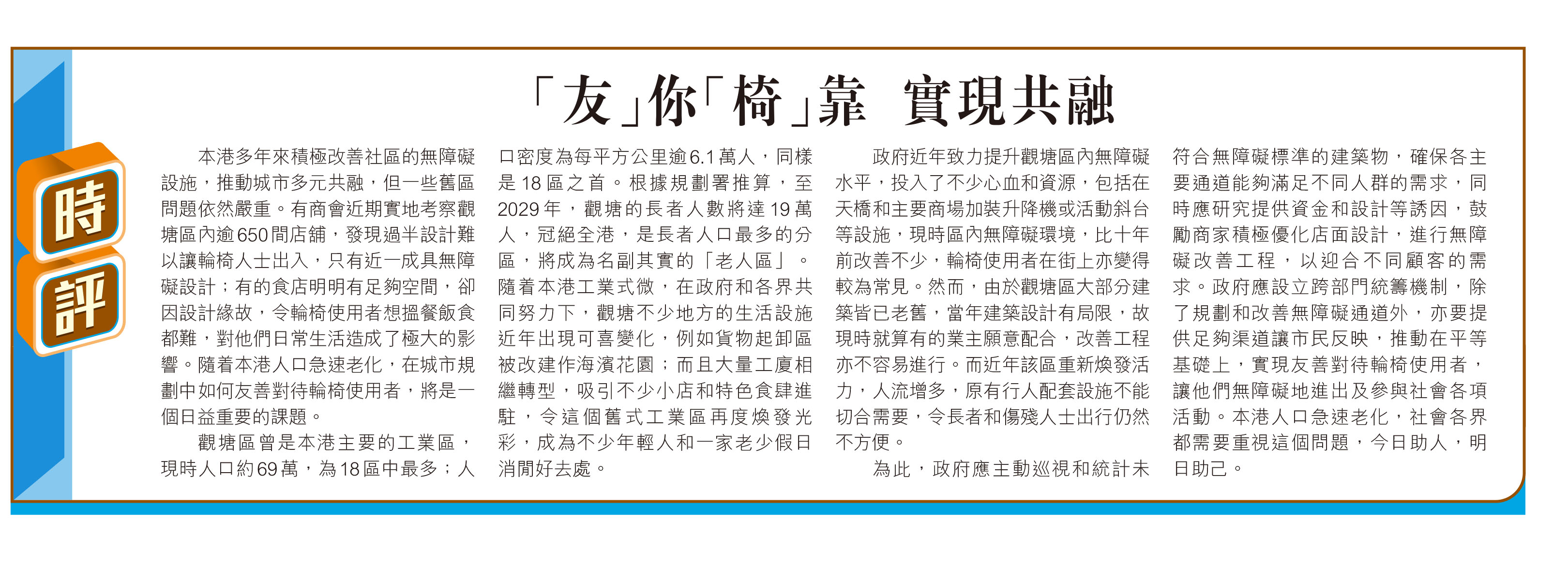 本港多年來積極改善社區的無障礙設施,推動城市多元共融,但一些舊區問題依然嚴重。有商會近期實地考察觀塘區內逾650間店舖,發現過半設計難以讓輪椅人士出入,只有近一成具無障礙設計;有的食店明明有足夠空間,卻因設計緣故,令輪椅使用者想搵餐飯食都難,對他們日常生活造成了極大的影響。隨着本港人口急速老化,在城市規劃中如何友善對待輪椅使用者,將是一個日益重要的課題。