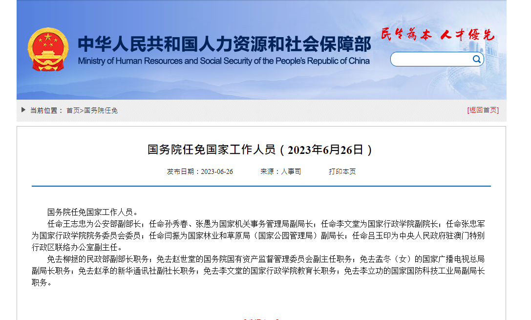 大公文匯全媒體報道,據人社部網站今日(26日)消息,國務院任免國家工作人員。任命王志忠為公安部副部長;任命孫秀春、張愚為國家機關事務管理局副局長;任命李文堂為國家行政學院副院長;任命張忠軍為國家行政學院院務委員會委員;任命閆振為國家林業和草原局(國家公園管理局)副局長;任命呂玉印為中央人民政府駐澳門特別行政區聯絡辦公室副主任。