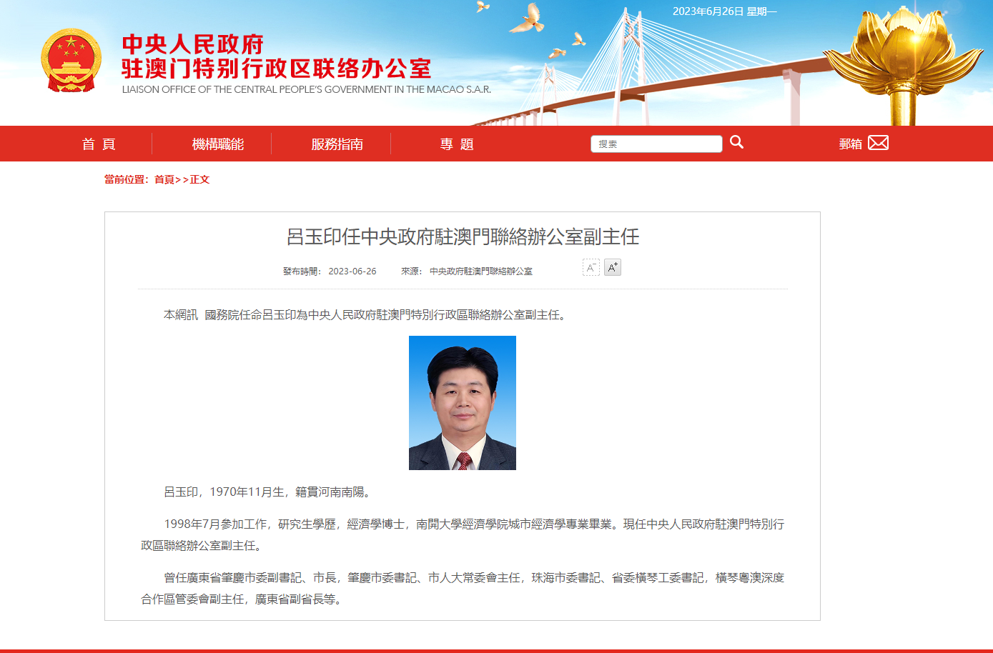 新任澳門中聯辦副主任的呂玉印,1970年11月生,此前擔任廣東省政府副省長、黨組成員、珠海市委書記,省委橫琴工委書記。澳門中聯辦網站顯示,呂玉印,1970年11月生,籍貫河南南陽。1998年7月參加工作,研究生學歷,經濟學博士,南開大學經濟學院城市經濟學專業畢業。現任中央人民政府駐澳門特別行政區聯絡辦公室副主任。曾任廣東省肇慶市委副書記、市長,肇慶市委書記、市人大常委會主任,珠海市委書記、省委橫琴工委書記,橫琴粵澳深度合作區管委會副主任,廣東省副省長等。