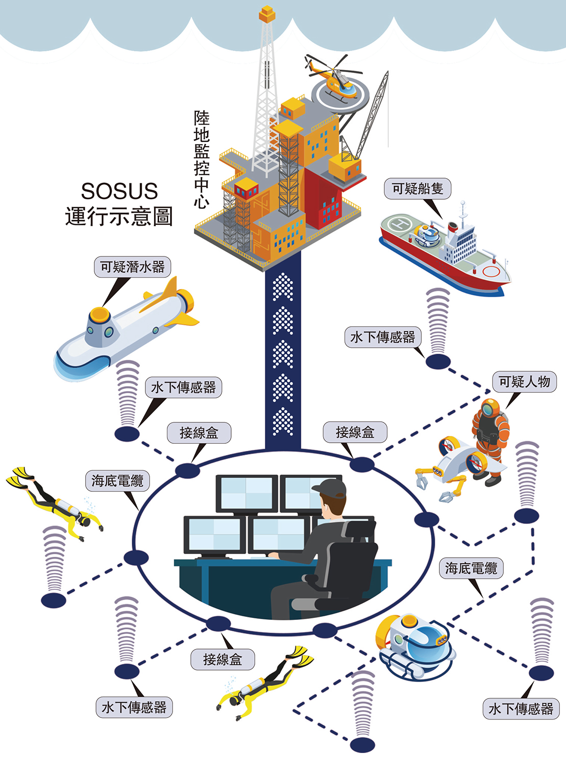 SOSUS通過在全球海底鋪設電纜,利用水下監聽器等設備搜集潛艇發出的聲波和磁氣數據,探測出潛艇位置並推算其運動方向及速率,能監聽到幾百米深海底的動靜。