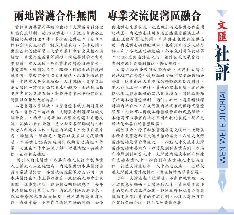 首批參與醫管局早前推出的「大灣區專科護理知識交流計劃」的70位護士,4月抵港參與公立醫院的基礎護理工作,多位兩地護士昨日分享工作和合作交流心得,認為溝通良好、合作無間,更能互相借鏡學習。之前本港社會有意見擔心因語言、專業存在差異等問題,內地醫護難以與本港醫護、病人溝通,恐影響本港醫療服務質素。事實證明,所謂的差異、阻礙,通過兩地醫護坦誠交流、學習完全可以妥善解決,結果對兩地醫護、本港病人是多贏局面。人才流通、專業交融是大灣區一體化的必然要求和趨勢,兩地應推動更多專業的交流互動,對提升專業水平和促進大灣區融合發展大有裨益。