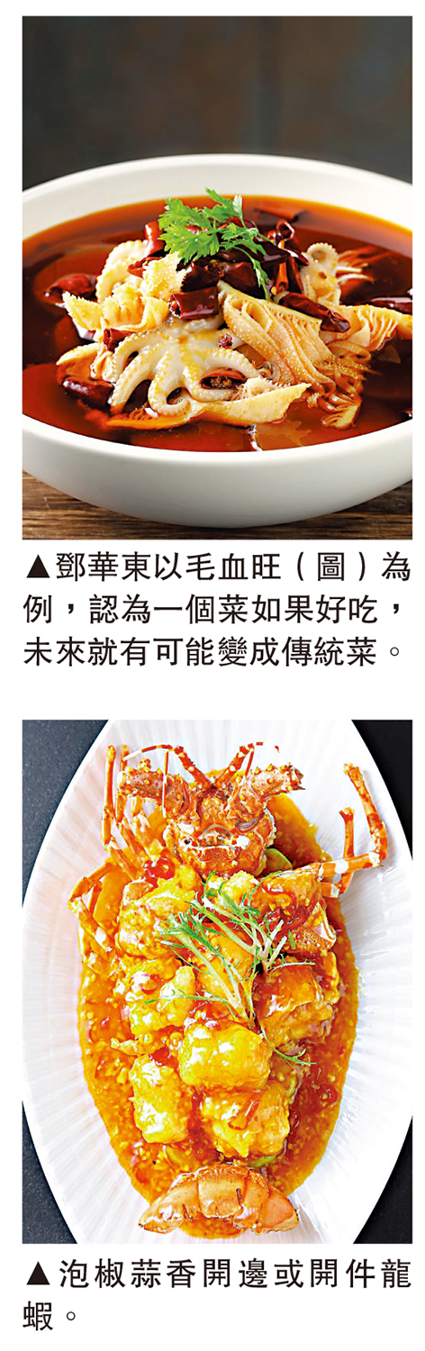 儘管並不提倡過分使用辣椒,主張適可而止,鄧華東仍相信應該要跟着時代走,「你不能說『我要把傳統捏得緊緊的』。什麼叫傳統?一個菜好吃,五十年以後就是傳統,比如毛血旺。如果這個菜在五十年以後都還在我們的餐桌上,證明它是大家喜歡的傳統菜了。」