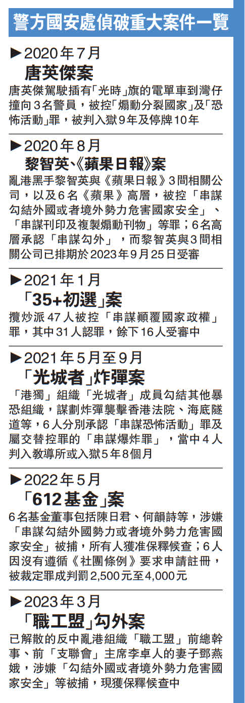 (香港文匯報 記者 蕭景源 綜合報道)香港警務處國家安全處(國安處)成立近3年來,根據香港國安法堅定忠誠地履行維護國家安全的使命和職責,成為維護國家安全的神盾利劍。截至今年6月初,警方國安處共拘捕253人,當中155人和5間公司已被起訴,79人已被定罪,令正義得以伸張,法治得以彰顯。警務處處長蕭澤頤指出,多宗國安案件陸續確立案例,法庭作出了阻嚇性裁決,並肯定了香港國安法運用的法理依據,為國安法的實踐和未來推展維護國家安全的工作,奠定了堅實的基礎。