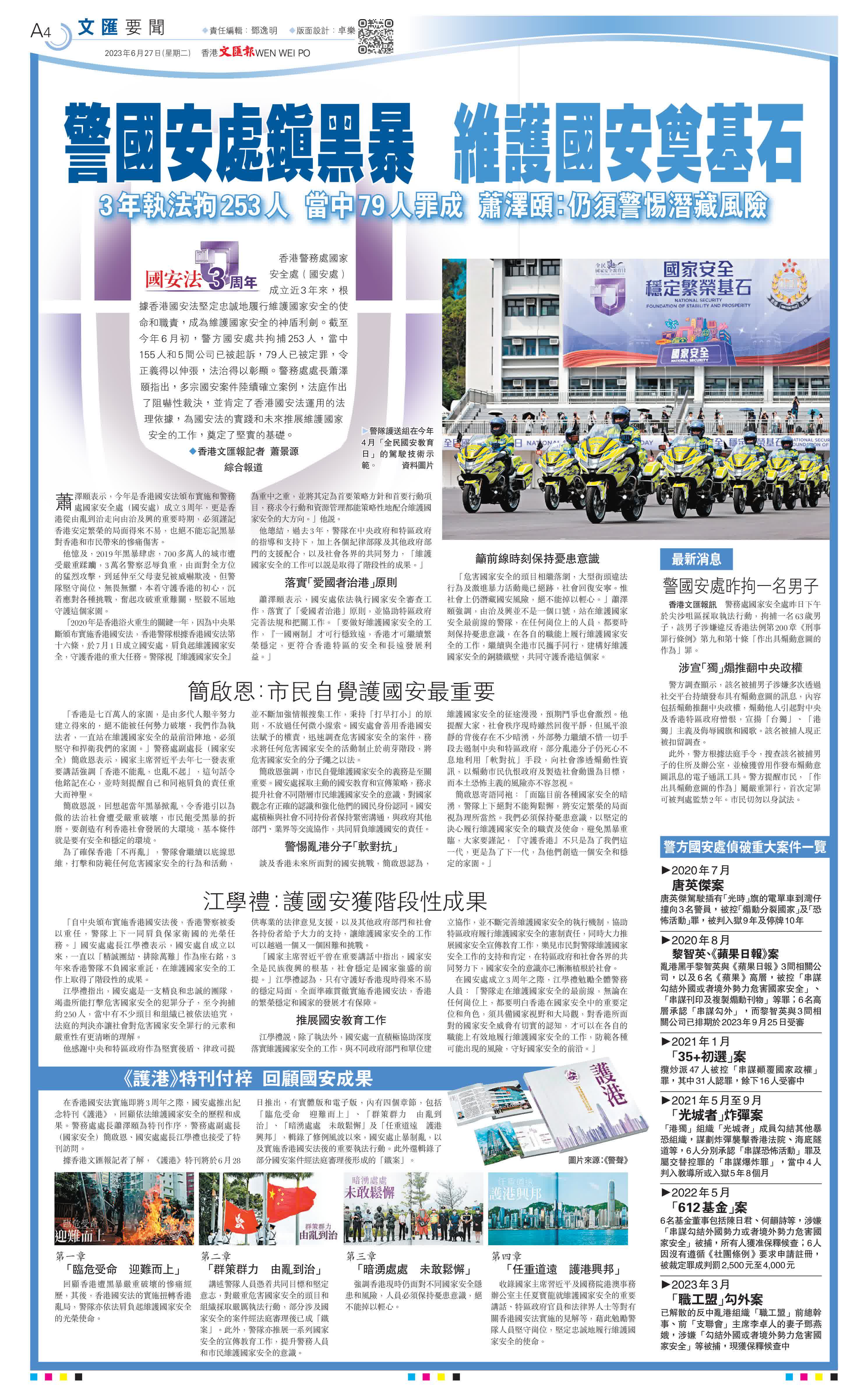 在香港國安法實施即將3周年之際,國安處推出紀念特刊《護港》,回顧依法維護國家安全的歷程和成果。警務處處長蕭澤頤為特刊作序,警務處副處長(國家安全)簡啟恩、國安處處長江學禮也接受了特刊訪問。
