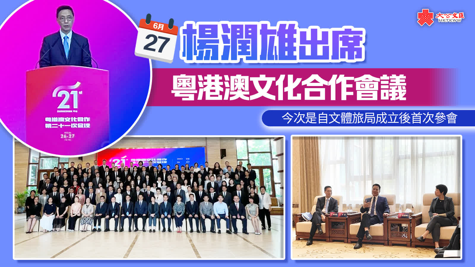 大公文匯全媒體報道,文化體育及旅遊局局長楊潤雄今日(27日)在中山出席粵港澳文化合作第二十一次會議,並與廣東省文化和旅遊廳廳長李斌和澳門文化局局長梁惠敏會面。楊潤雄表示,粵港澳各城市地緣相近、語言相通,一直以來在藝文方面合作和交流頻繁。今次是自文體旅局成立後首次參與粵港澳文化合作會議,他相信可進一步增進三方聯繫,攜手說好中國故事。