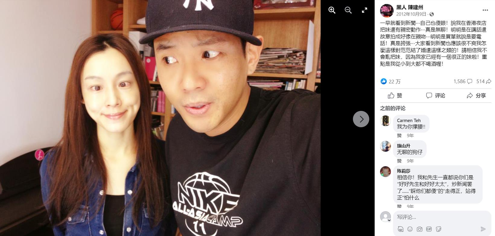 以愛妻形象示人的陳建州,與妻子范瑋琪婚姻更已步入12個年頭。據台媒,陳建州發的聲明是和范瑋琪的聯合聲明,范范表態支持老公。針對聲明,大牙透過經紀人回應「本人陳述均為事實,問心無愧,公道自在人心。」