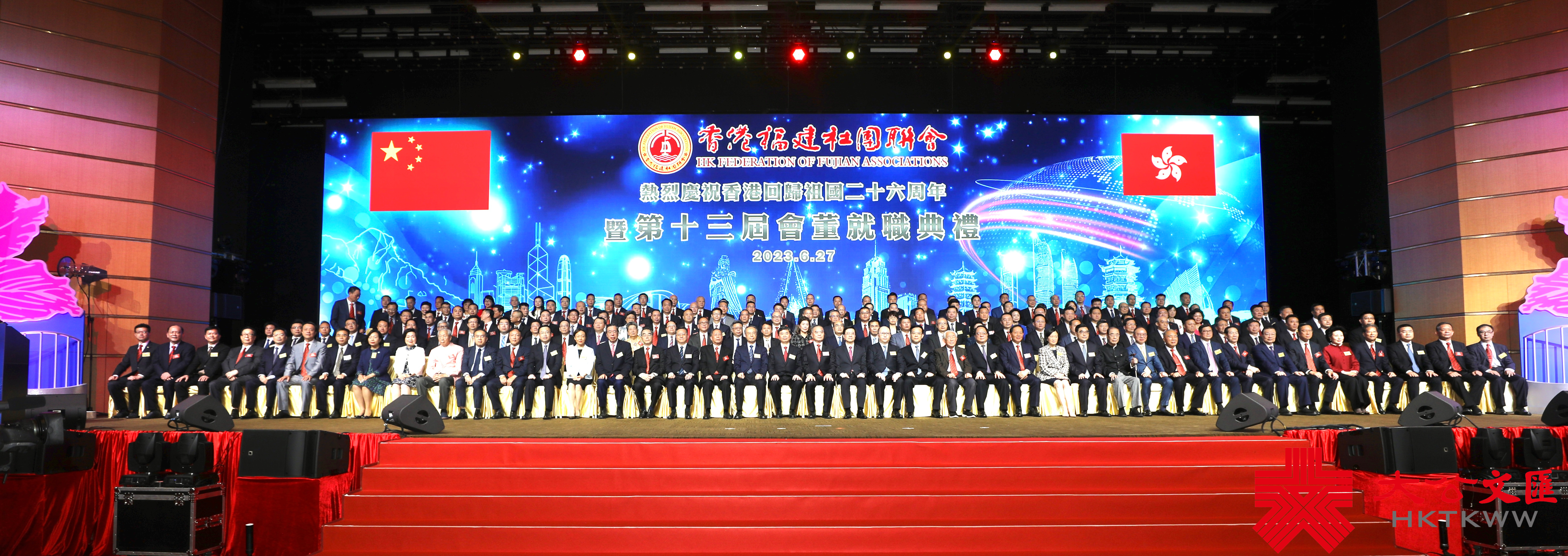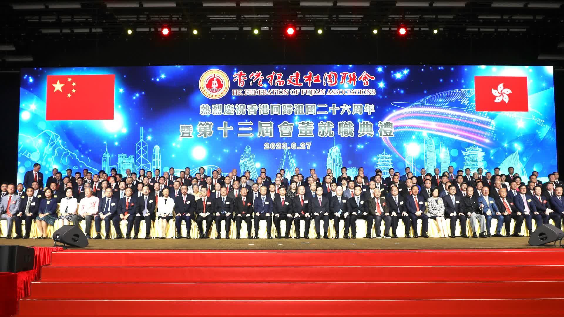 (大公文匯全媒體 記者 龔學鳴)6月27日晚,香港福建社團聯會於灣仔會展中心隆重舉行慶祝香港回歸祖國26周年暨第十三屆會董就職典禮。行政長官李家超,福建省委書記、省人大常委會主任周祖翼,中聯辦主任鄭雁雄,中國僑聯主席萬立駿,外交部駐港特派員公署署理特派員潘雲東,國安公署副署長李江舟等,以及來自香港社會各界、福建省慶賀團、中華海外聯誼會、中國僑聯、港區全國人大代表、全國政協委員、閩籍選委員以及閩籍鄉親等逾2000人出席慶典。
