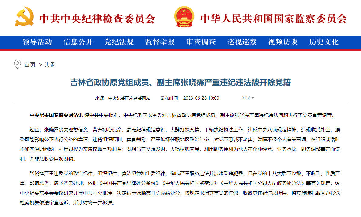 據中央紀委國家監委網站消息,經中共中央批准,中央紀委國家監委對吉林省政協原黨組成員、副主席張曉霈嚴重違紀違法問題進行了立案審查調查。