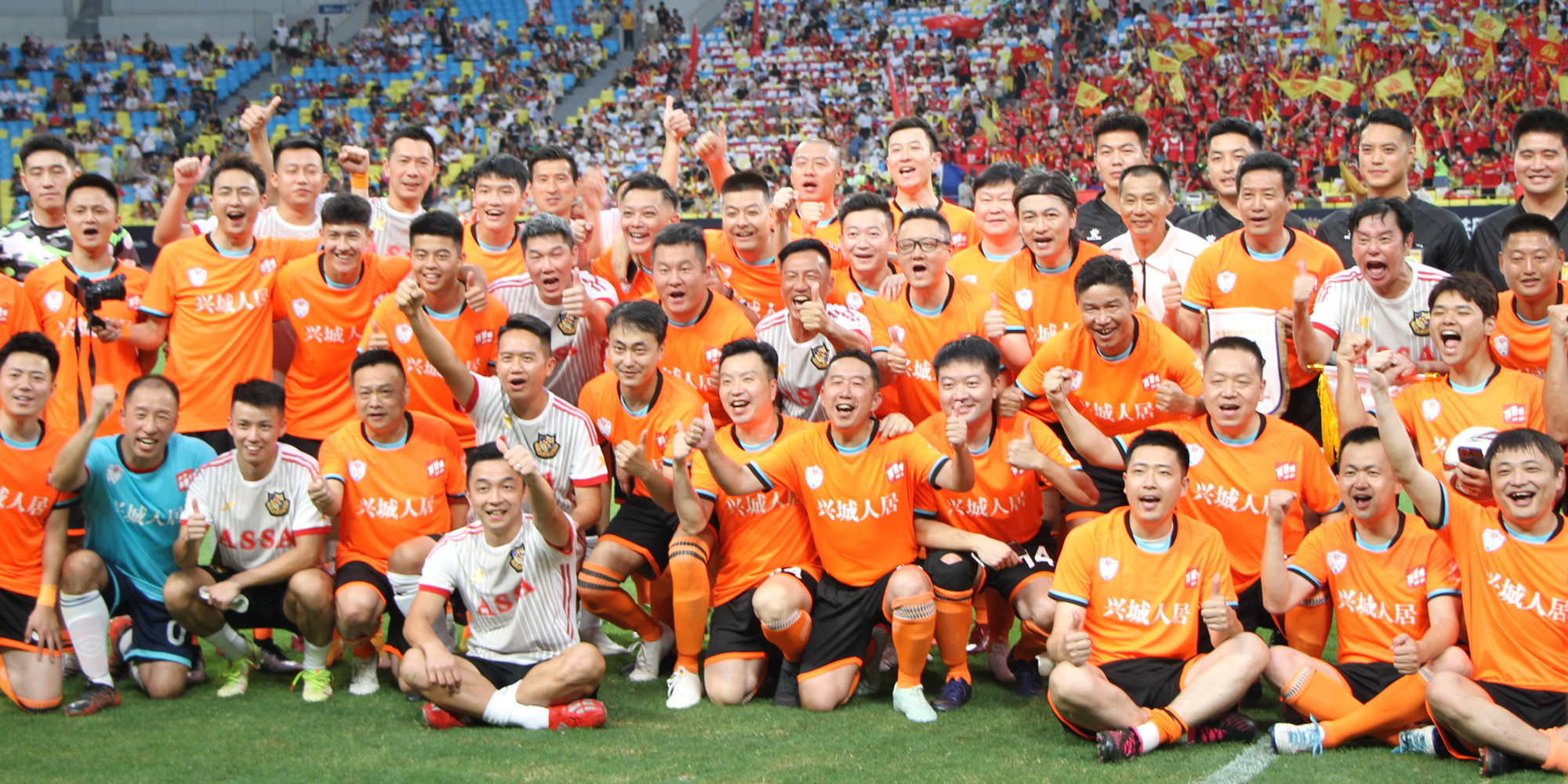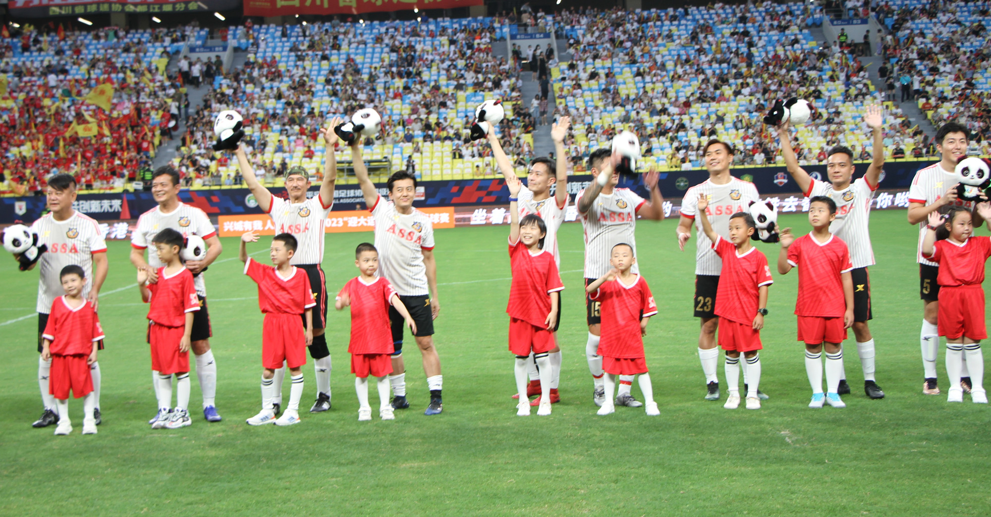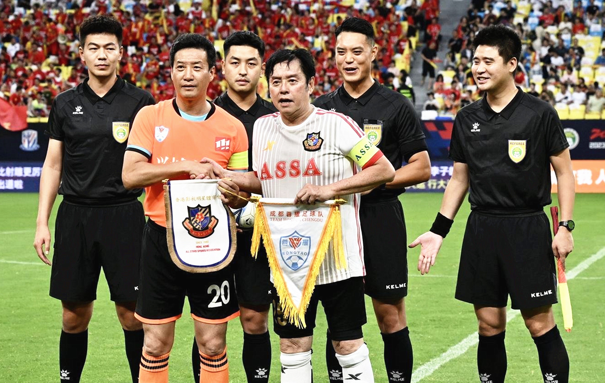 依稀往夢似曾見,心內波瀾現;拋開世事斷仇怨,相伴到天邊……第一節比賽結束後,兩位香港球員走進球迷中間唱起經典歌曲《鐵血丹心》,「靖哥哥」黃日華則在球場上比划起劇中的武術動作。接着,蓉耀球員搶過話筒,深情獻唱《我的未來不是夢》,全場球迷熱血沸騰,歌聲響徹四方。港星一首《萬水千山總是情》,蓉耀球員一首小虎隊的《愛》。李克勤的《紅日》、劉德華的《中國人》……一首首經典老歌在鳳凰山體育公園上空飄揚。