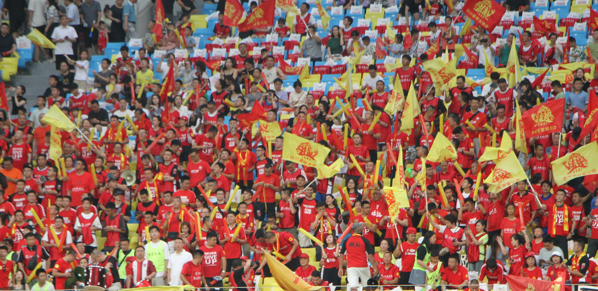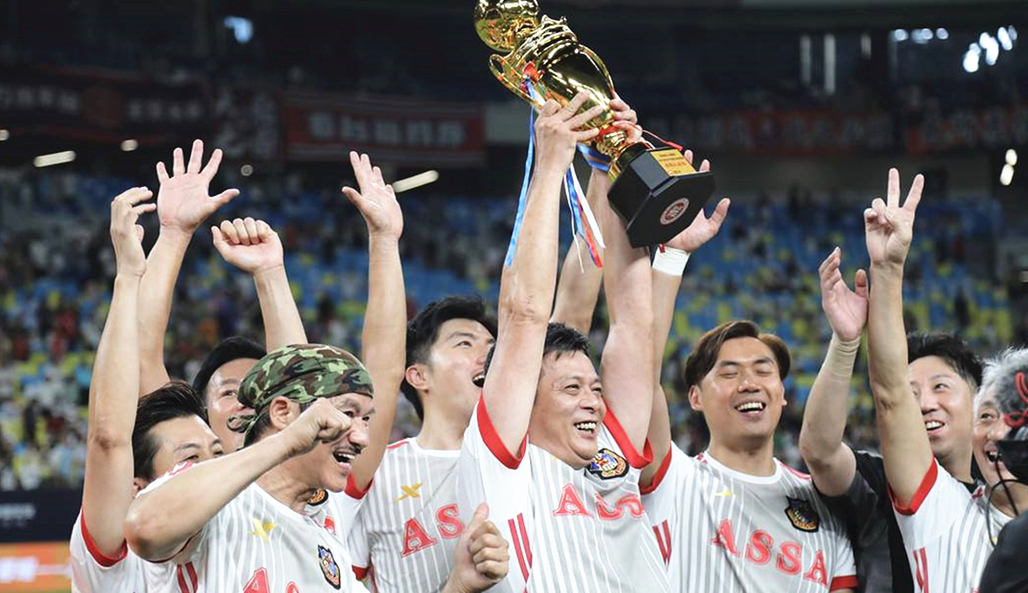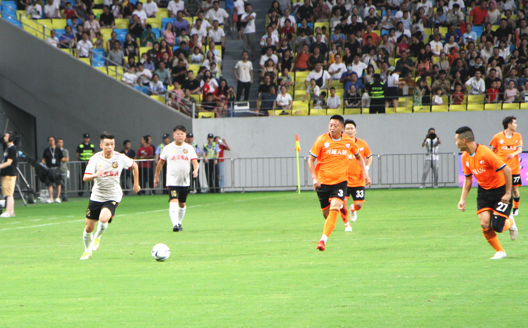 依稀往夢似曾見,心內波瀾現;拋開世事斷仇怨,相伴到天邊……第一節比賽結束後,兩位香港球員走進球迷中間唱起經典歌曲《鐵血丹心》,「靖哥哥」黃日華則在球場上比划起劇中的武術動作。接着,蓉耀球員搶過話筒,深情獻唱《我的未來不是夢》,全場球迷熱血沸騰,歌聲響徹四方。港星一首《萬水千山總是情》,蓉耀球員一首小虎隊的《愛》。李克勤的《紅日》、劉德華的《中國人》……一首首經典老歌在鳳凰山體育公園上空飄揚。