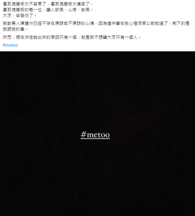島內女星大牙(周宜霈)27日在社交媒體發文控訴,11年前遭男星陳建州(昵稱「黑人」)性騷擾的故事。隨後陳建州和妻子范瑋琪28日發表共同聲明,對大牙提出民事訴訟,要求賠償新台幣1000萬元,並在臉書刊登道歉啟事以維護自身名譽。這一舉動不僅沒有讓事件平息,反而引起其他受害者郭源元不惜自揭傷疤也要站出來揭發陳建州,「不願讓大牙一個人」郭源元在貼文最後寫到。首度發聲控訴陳建州性騷擾一事的大牙也現身郭源元的留言區回應:「我哭了,我懂妳的害怕,我哭了,原來他的魔爪伸這麼長!好心疼妳,我不是一個人,妳也不是一個人。」而大牙老公阿廖師隨後也現身感謝:「謝謝妳的勇敢」。