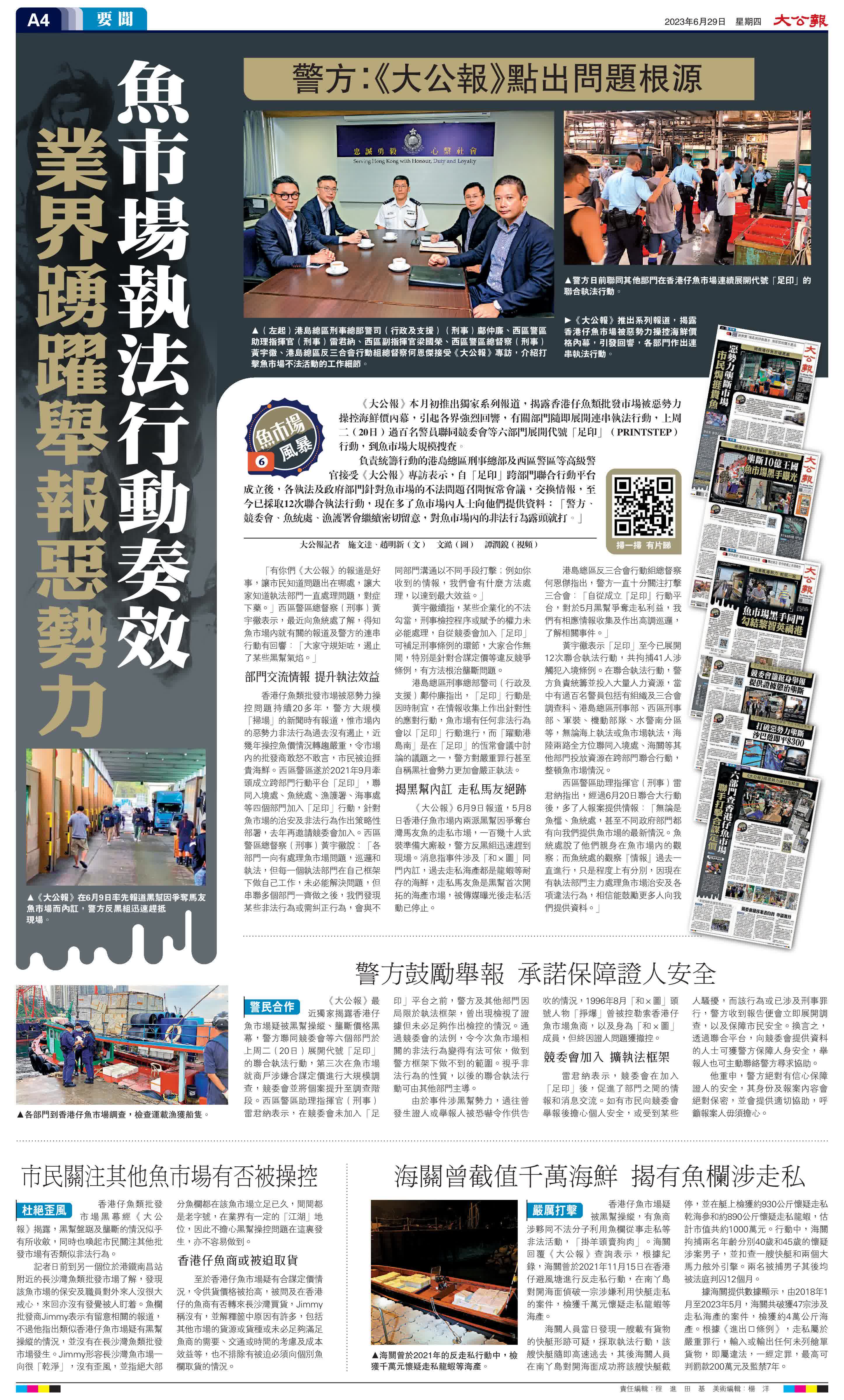 「有你們《大公報》的報道是好事,讓市民知道問題出在哪處,讓大家知道執法部門一直處理問題,對症下藥。」西區警區總督察(刑事)黃宇徽表示,最近向魚統處了解,得知魚市場內就有關的報道及警方的連串行動有回響:「大家守規矩咗,遏止了某些黑幫氣焰。」