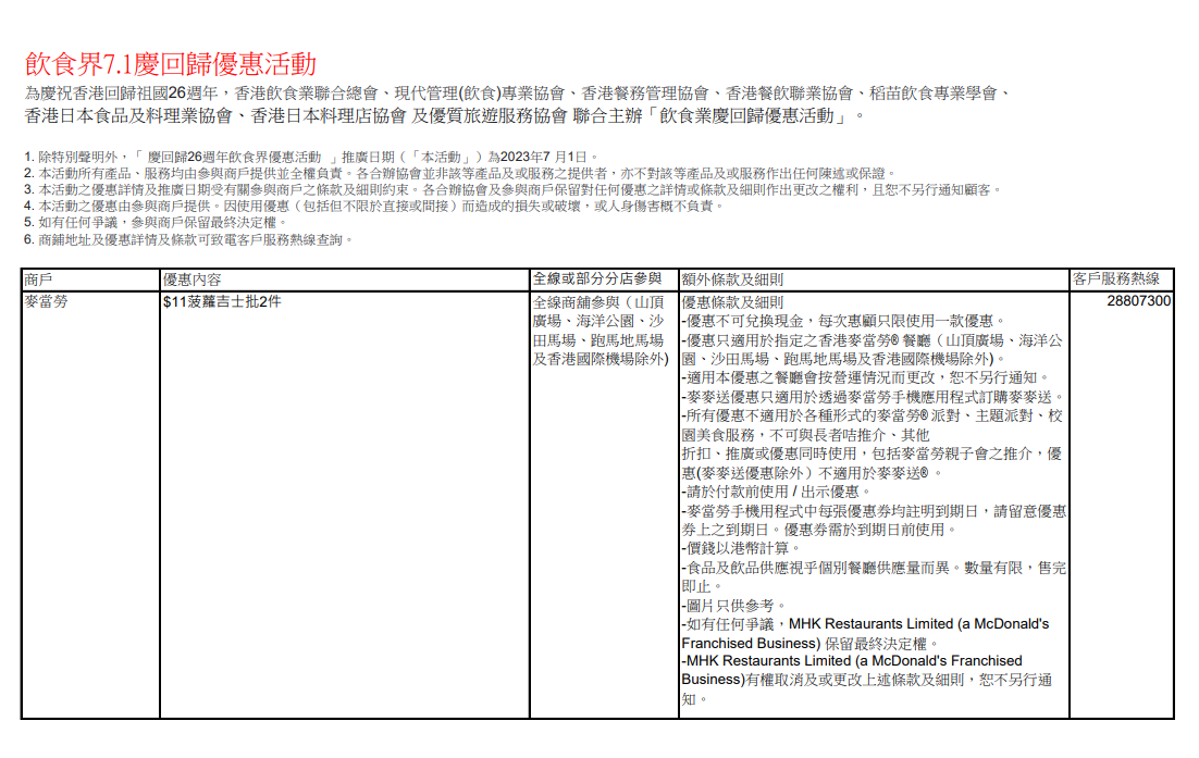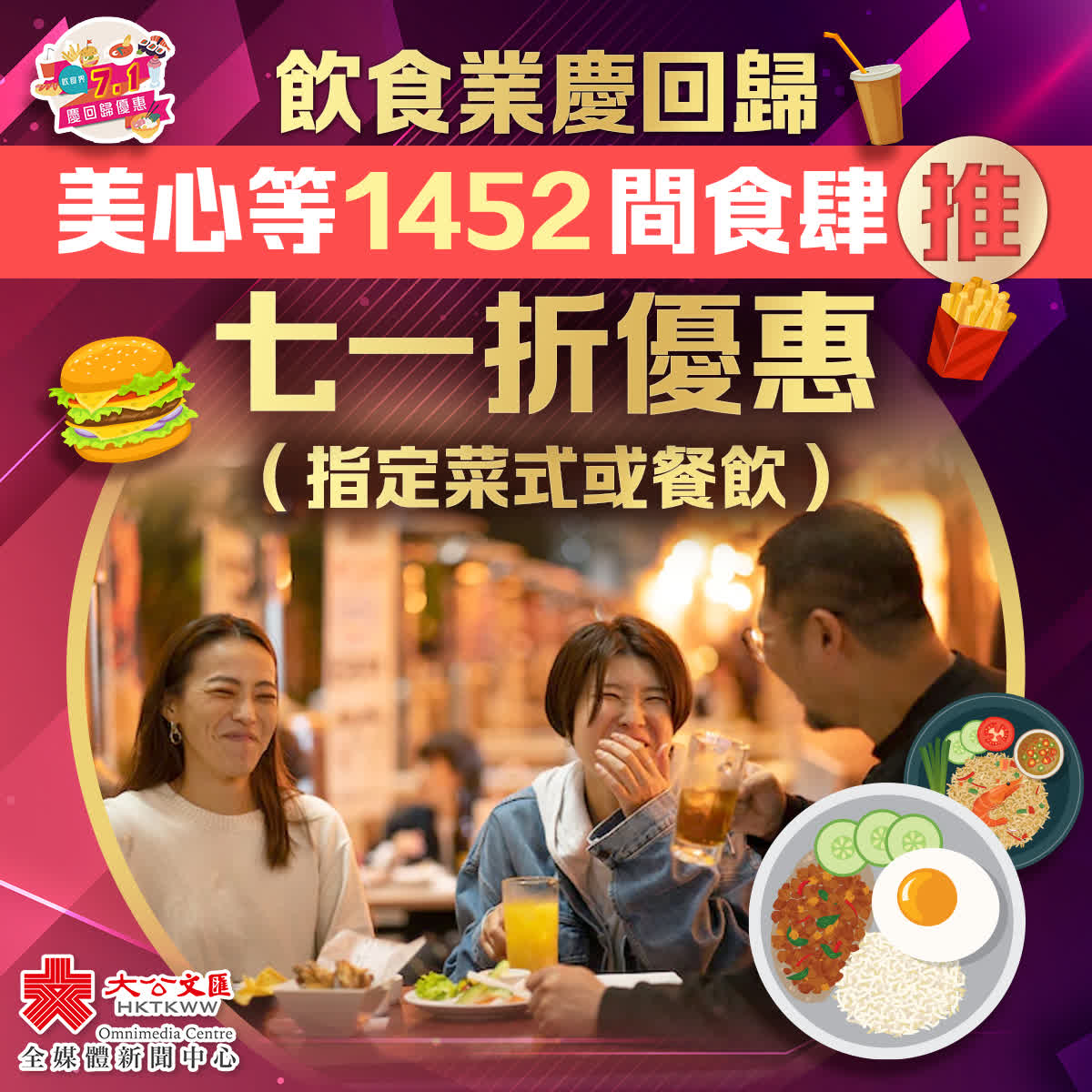 大公文匯全媒體報道,特首李家超早前公布,為慶祝香港回歸祖國26周年,飲食業界7月1日會有超過1000間食肆推出指定菜式或餐飲品有七一折優惠。飲食界立法會議員張宇人聯同7個飲食業協會代表今日(29日)見記者,講解「飲食業慶回歸優惠活動」詳情。7月1日當天,合共1452間食肆推出優惠活動,指定菜式或餐飲品有七一折優惠,包括美心、富臨、福苑、大家樂、大快活、海港、稻香等餐飲集團,以及麥當勞、肯德基等快餐店。