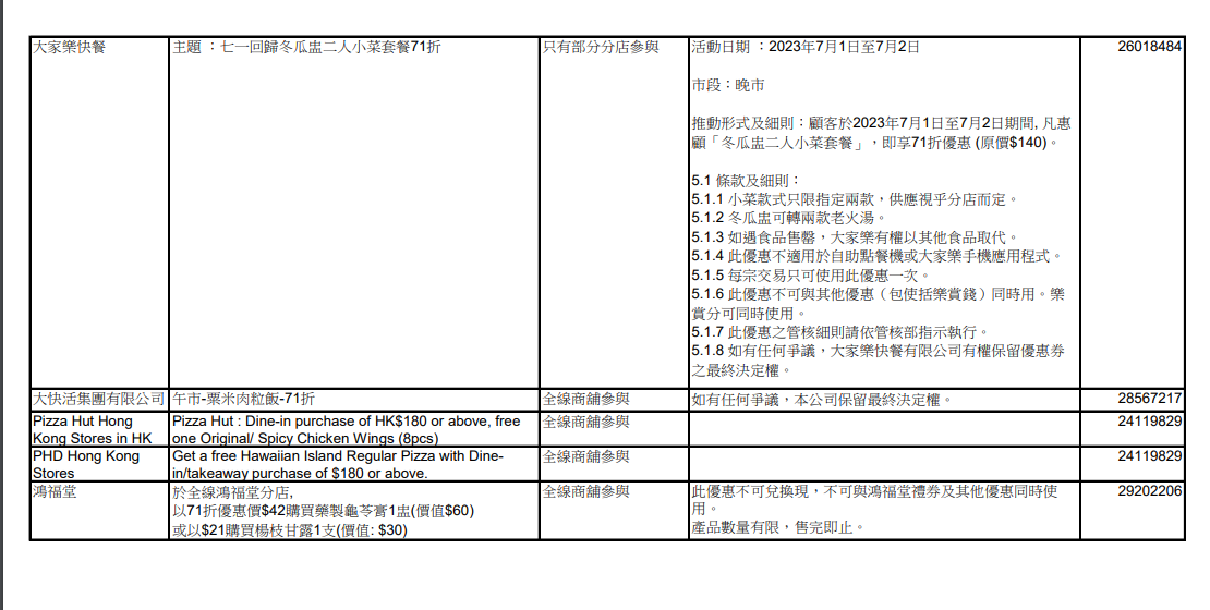 大家樂快餐推出的優惠活動是冬瓜盅二人小菜套餐七一折,大快活集團推出的是粟米肉粒飯七一折優惠(僅限午市)。詳情見下圖↓↓