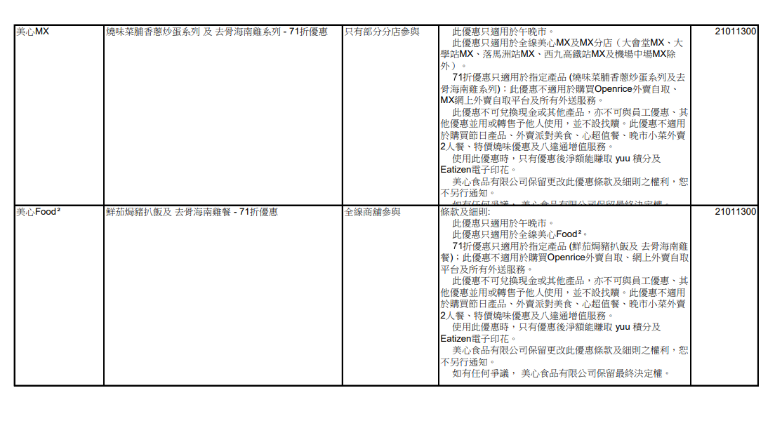美心MX推出的優惠活動是燒味菜脯香蔥炒蛋系列及去骨海南雞系列七一折優惠,美心Food推出鮮茄焗豬扒飯及去骨海南雞餐七一折優惠。詳情見下圖↓↓