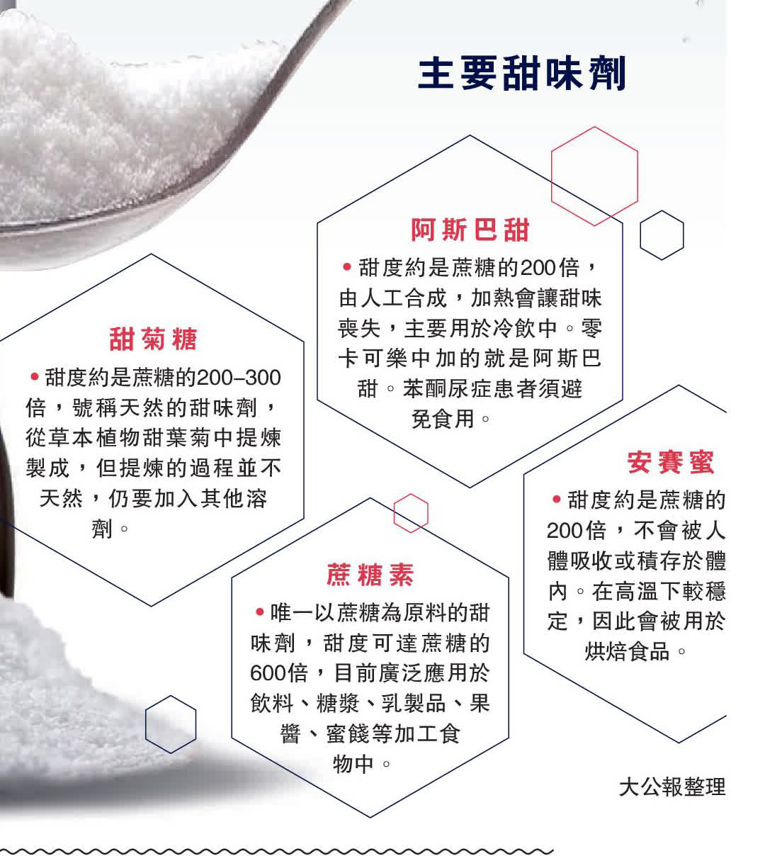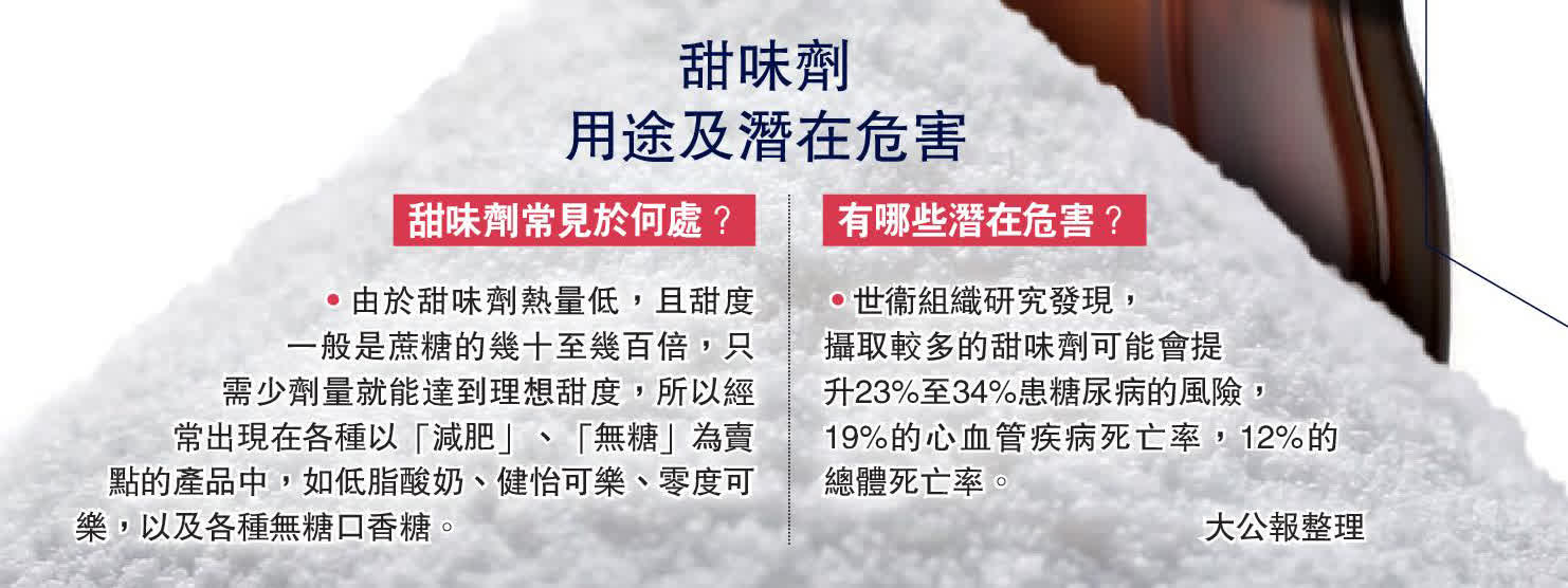 除了致癌風險,世衞上月發布指南,建議消費者不要使用無糖甜味劑來控制體重,這些甜味劑或影響胰島素分泌,反而導致成年人患糖尿病、心血管疾病的風險增加。食品業對這份指南的爭議較大,他們認為這些甜味劑仍可幫助那些想減少糖分攝取的消費者。