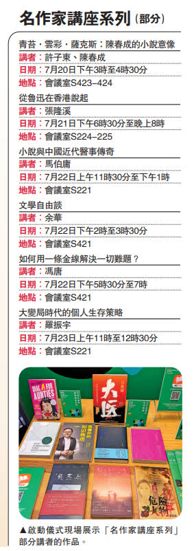 今次書展共推薦9位傑出作家,分別為阿濃、周蜜蜜、韋婭、孫慧玲、梁望峯、潘明珠、潘金英、君比(已故)及何紫(已故),其中6位作家將親身來到書展,分享他們的創作歷程,君比好友胡寶秀、陳美思將代其出席講座,何紫薇則代表已故父親何紫到場分享。今次書展繼續為讀者帶來八大講座系列,其中「名作家講座系列」邀請到余華、馬伯庸、許知遠、羅振宇、龐貝、陳春成等組成講者陣容,與書迷分享創作點滴。