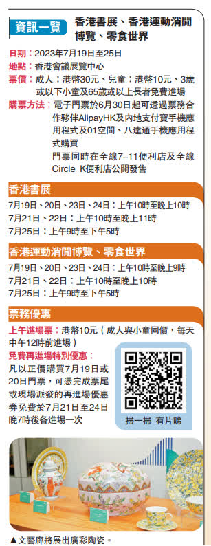 書展門票今起發售,成人門票由往年的25元加至30元,且書展現場將不設實體門票銷售,市民可在會場入口收費站以AlipayHK、內地支付寶手機應用程式或八達通即時付費入場。除了書展,大會亦積極聯繫各界舉辦「文化七月」活動,在全港十八區內籌辦多項寫作分享會、講座、新書發布會等。