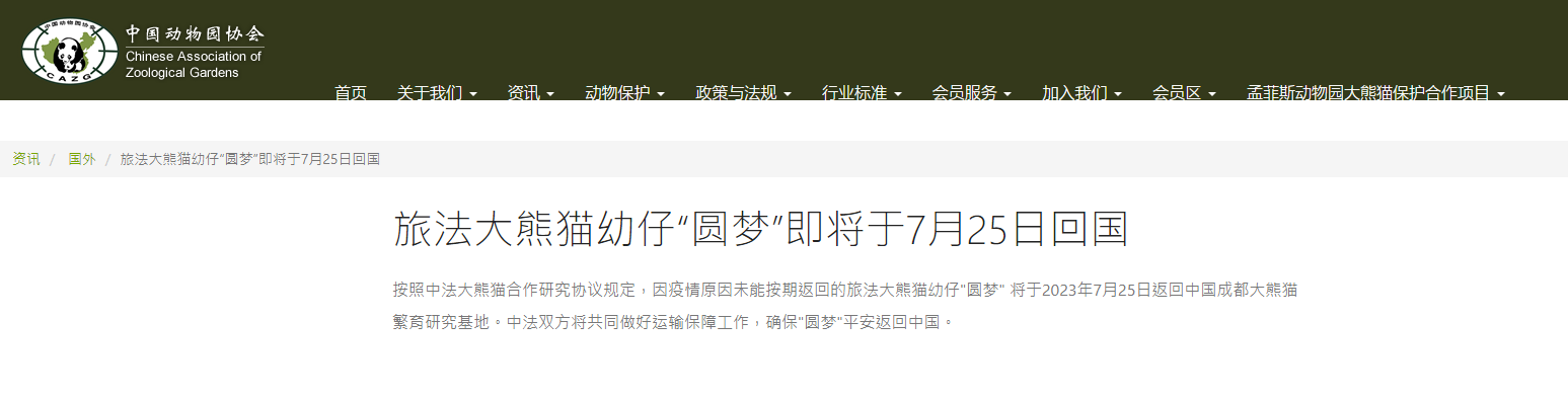 據中國動物園協會官網最新消息,按照中法大熊貓合作研究協議規定,因疫情原因未能按期返回的旅法大熊貓幼仔「圓夢」,將於7月25日返回中國成都大熊貓繁育研究基地。中法雙方將共同做好運輸保障工作,確保「圓夢」平安返回中國。