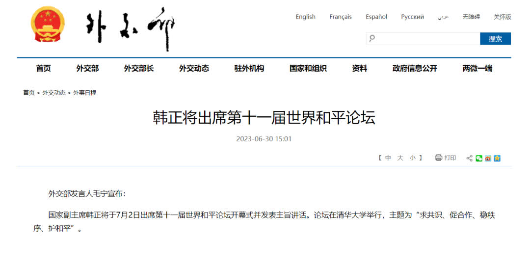 據外交部官網消息,外交部發言人毛寧宣布:國家副主席韓正將於7月2日出席第十一屆世界和平論壇開幕式並發表主旨講話。論壇在清華大學舉行,主題為「求共識、促合作、穩秩序、護和平」。