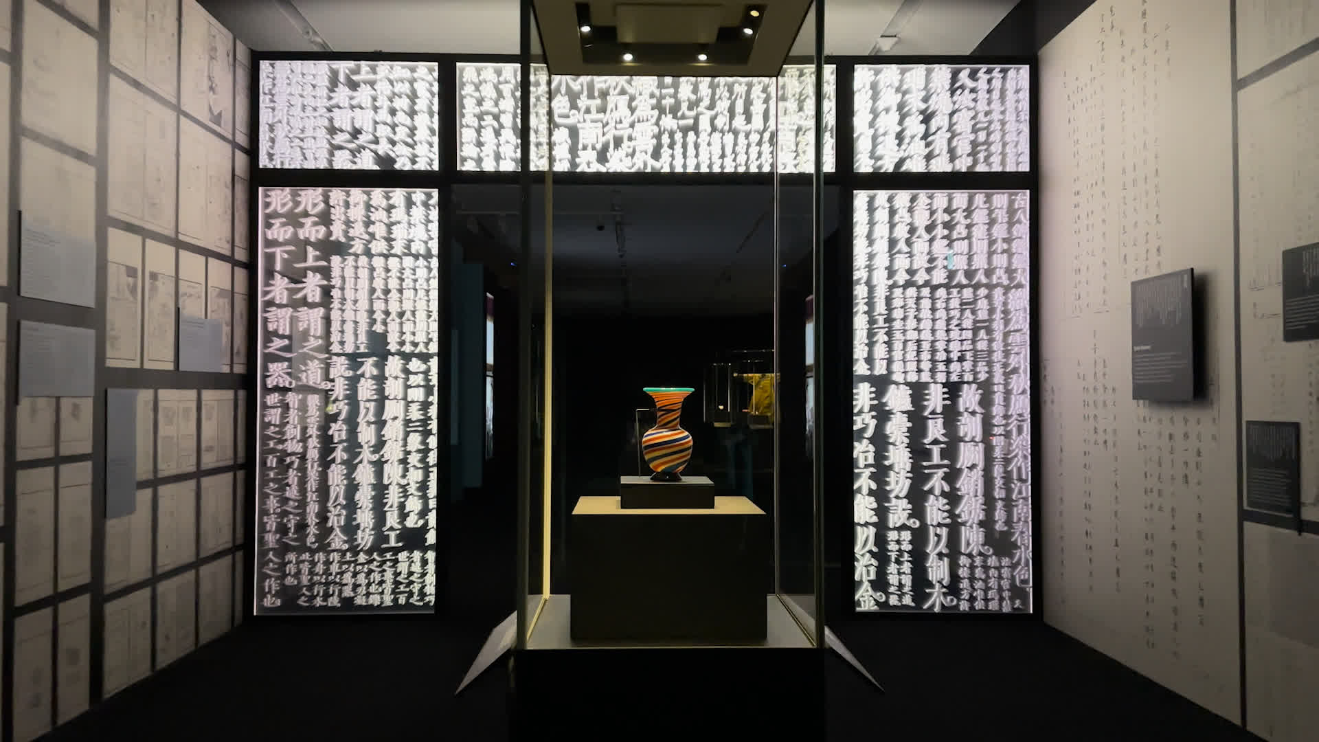 在5號展廳的「器惟求新 ── 當代設計對話古代工藝」中,團隊嘗試通過當代設計的理念,讓觀眾去重新理解傳統工藝。比如將清代內務府造辦處的文字資料重點抽出來在空間中呈現,以襯托突出展出的重點文物「乾隆款纏絲玻璃撇口瓶」。「它看起來很簡約,但設計和線條非常流動,製造方式其實很複雜。」游心然介紹,要先用白玻璃吹製,再安上紅藍兩色玻璃條,以打磨玉石的方式打磨到光滑平整,最後再加上口沿和底部的碧綠色玻璃瓶。