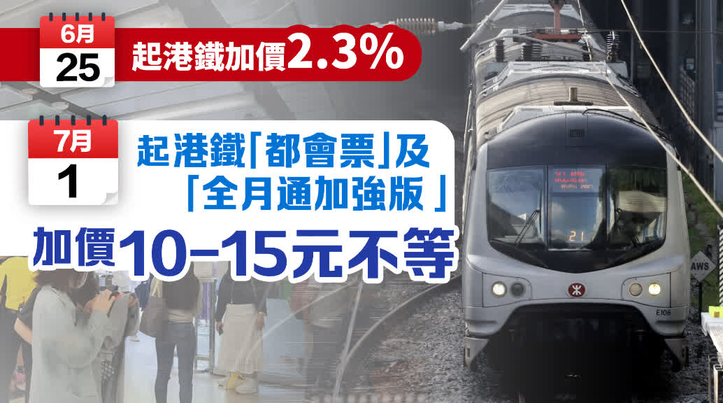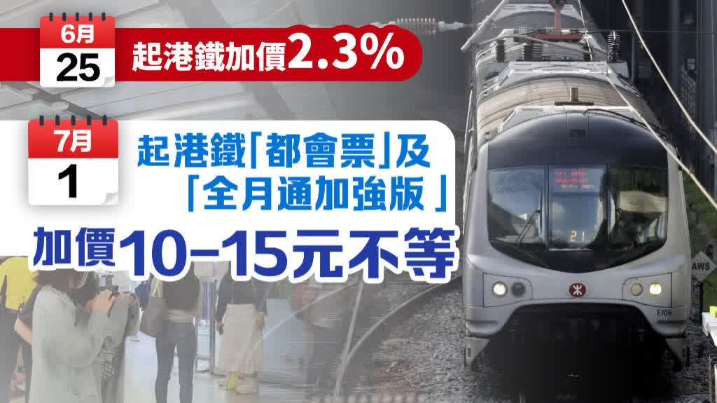 大公文匯全媒體報道,港鐵早前宣布6月25日起加價2.3%,市民常用的「都會票」、「全月通加強版」新售價在今日(7月1日)起生效,價格上調10至15元不等。