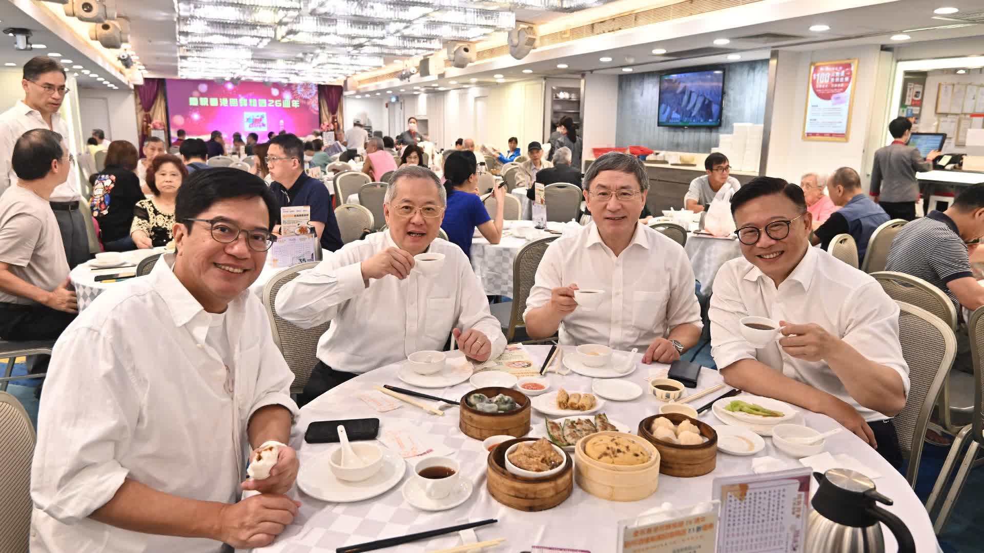 大公文匯全媒體報道,政務司副司長卓永興、財政司副司長黃偉綸和律政司副司長張國鈞今日(7月1日)出席香港特別行政區成立26周年升旗儀式和慶祝酒會後,聯袂到北角一家酒樓,體驗享用七一飲食優惠的喜悅,與市民共慶回歸。