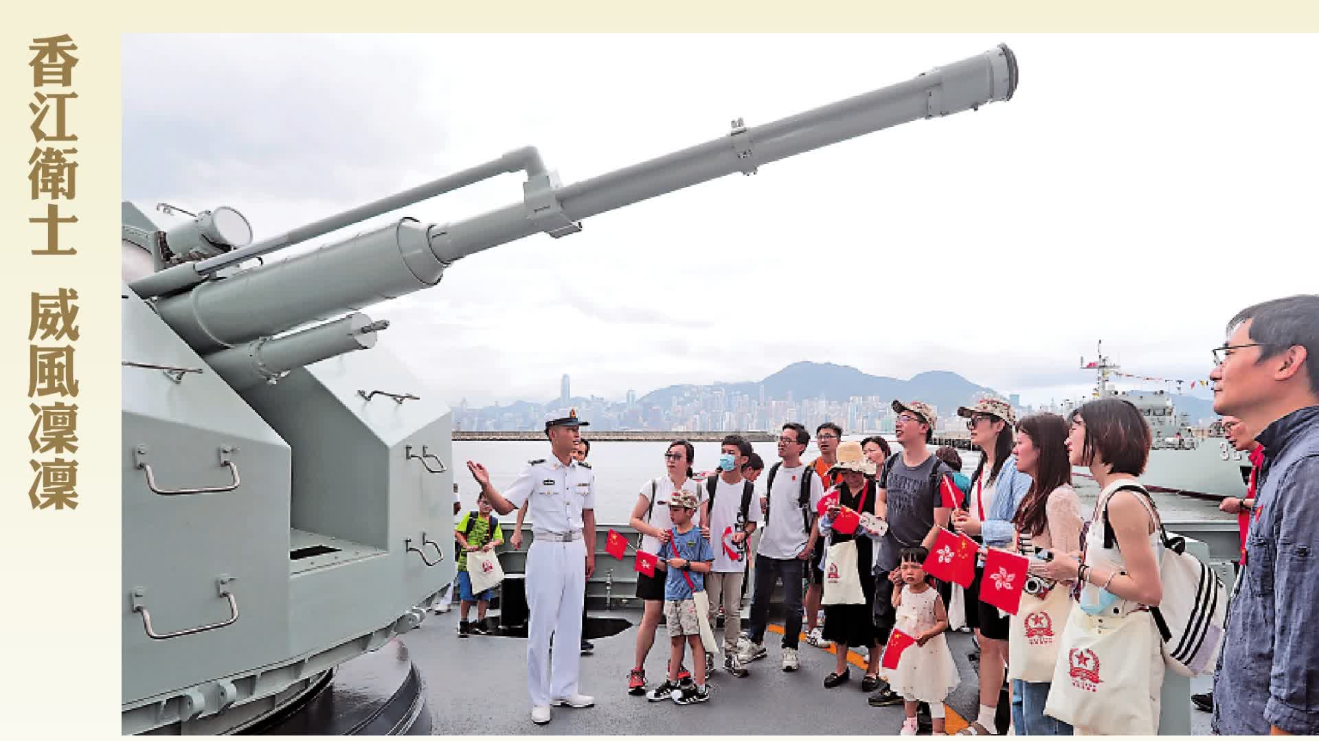在裝備展示區,海軍某型護衛艦等主戰裝備首次面向香港市民亮相,吸引不少市民走上甲板、走進艙室。裝甲車輛、步兵槍械等吸引眾多小朋友,擺出各種姿勢和駐軍官兵合影留念。