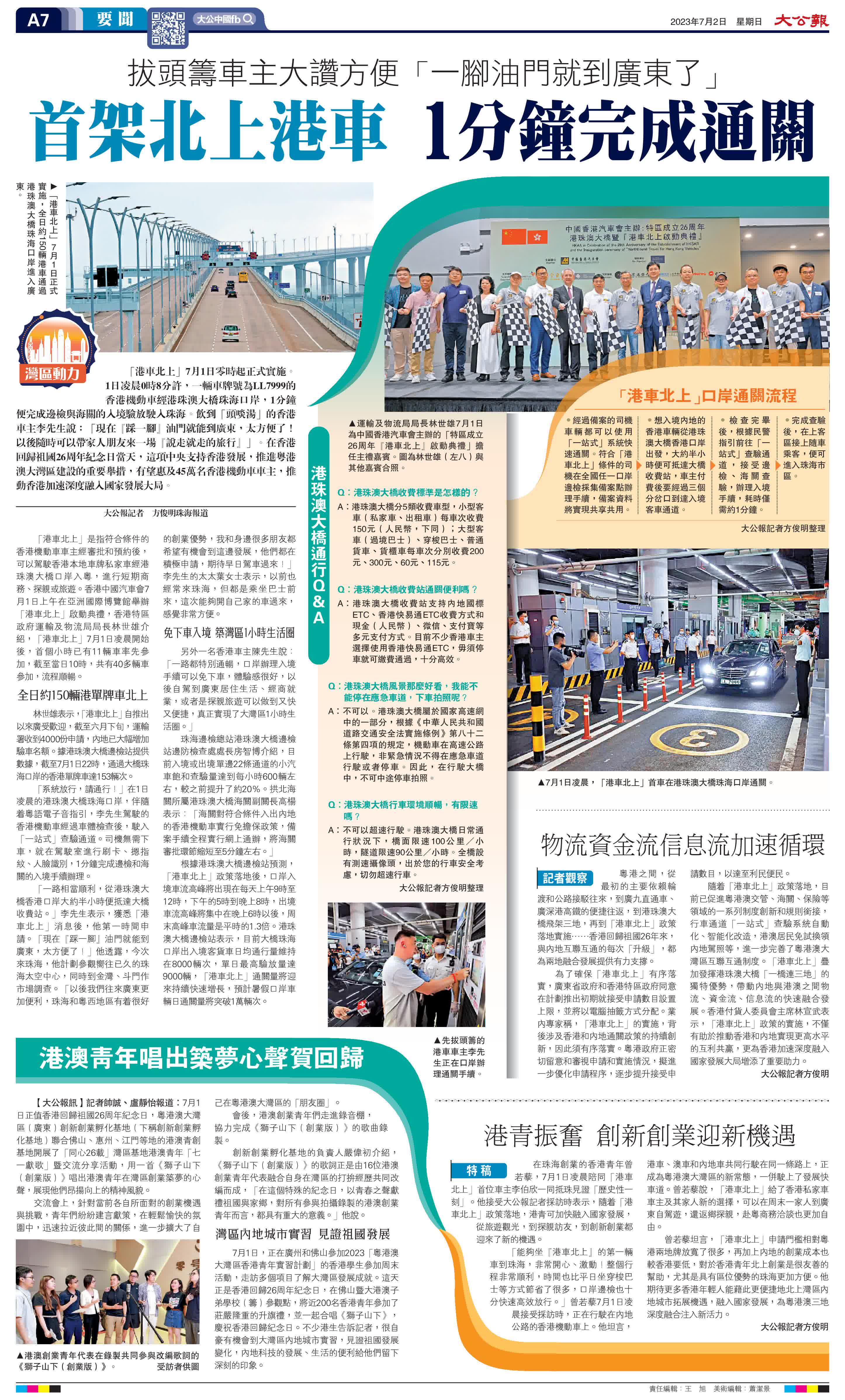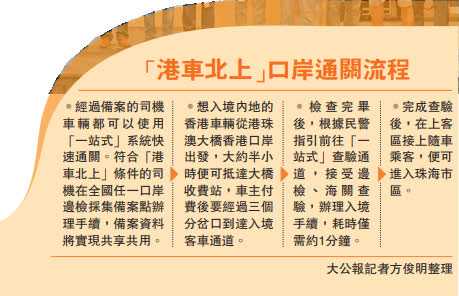 (大公報記者 方俊明珠海)「港車北上」7月1日零時起正式實施。1日凌晨0時8分許,一輛車牌號為LL7999的香港機動車經港珠澳大橋珠海口岸,1分鐘便完成邊檢與海關的入境驗放駛入珠海。飲到「頭啖湯」的香港車主李先生說:「現在『踩一腳』油門就能到廣東,太方便了!以後隨時可以帶家人朋友來一場『說走就走的旅行』」。在香港回歸祖國26周年紀念日當天,這項中央支持香港發展,推進粵港澳大灣區建設的重要舉措,有望惠及45萬名香港機動車車主,推動香港加速深度融入國家發展大局。